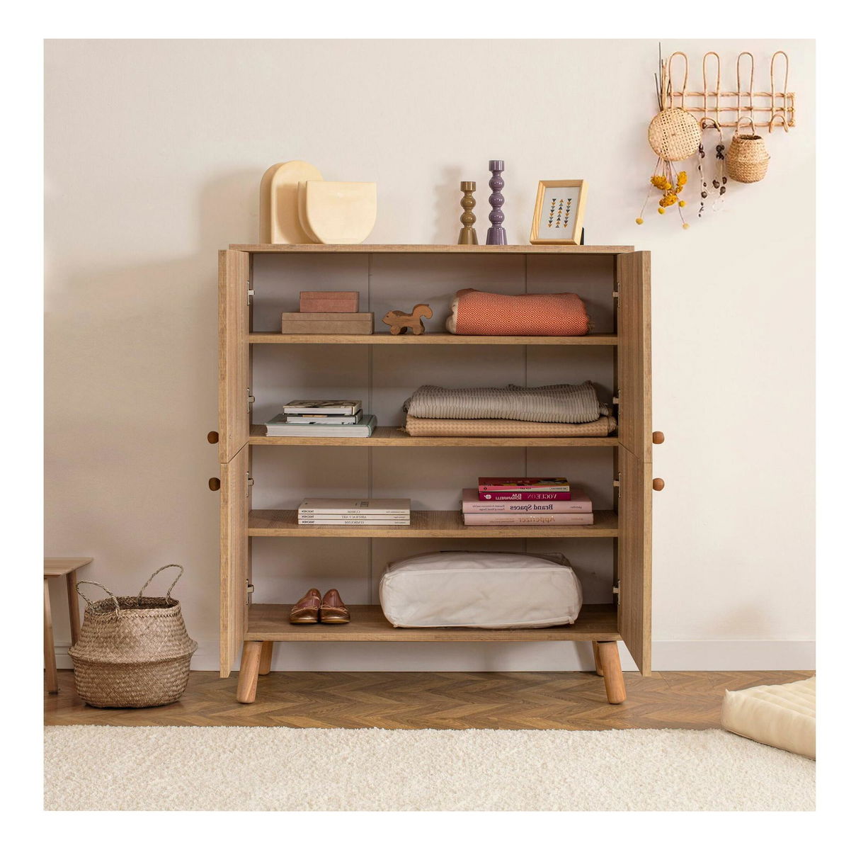 grosime: 18 mm, picioare din lemn strat UV lățime: 95 cm, înălțime: 111 cm, adâncime: 36 cm, înălțime picioare: 15 cm, înălțime raft: 19,8 cm