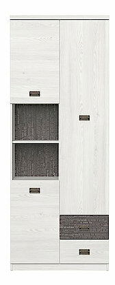 Dulap spațios cu rafturi, împărțit în jumătate de un perete despărțitor. Partea stângă conține 5 rafturi (inclusiv partea deschisă). Partea dreaptă conține 4 rafturi și 2 sertare.