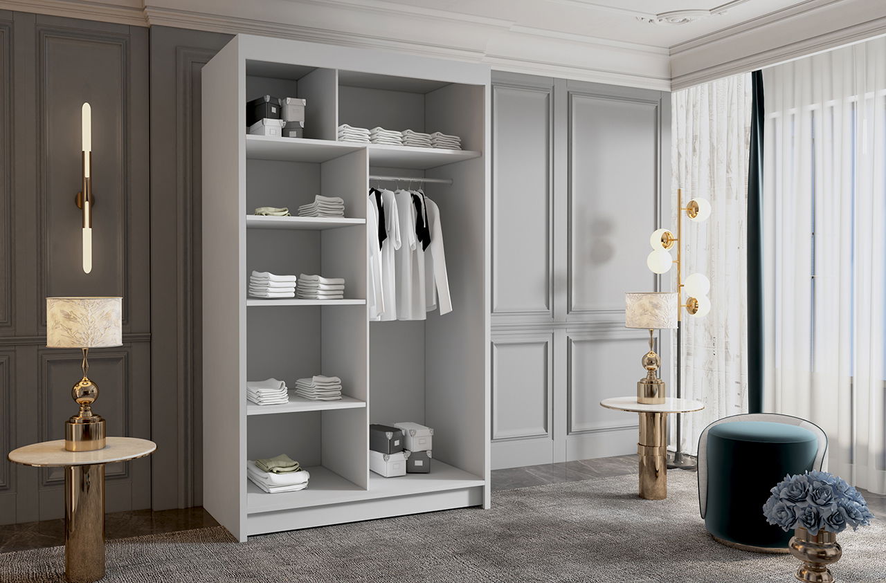 Dulap de haine este alegerea ideală pentru cei care preferă caracterul practic în locul designului. Dulapul are uși glisante și oferă mult spațiu de depozitare pentru lenjerie, haine și accesorii. Există o bară de agățat în partea stângă a dulapului și rafturi în partea dreaptă. În partea de sus există spațiu suplimentar de depozitare. Dulapul este fabricat din placă laminată cu grosimea de 16 mm și are un finisaj alb neted. Sistemul de uși glisante asigură confort și utilizare zilnică confortabilă. Mânerele sunt dreptunghiulare și de culoare argintie. Dulapul include o bară de agățat poziționată pe lungime și un total de 5 rafturi.