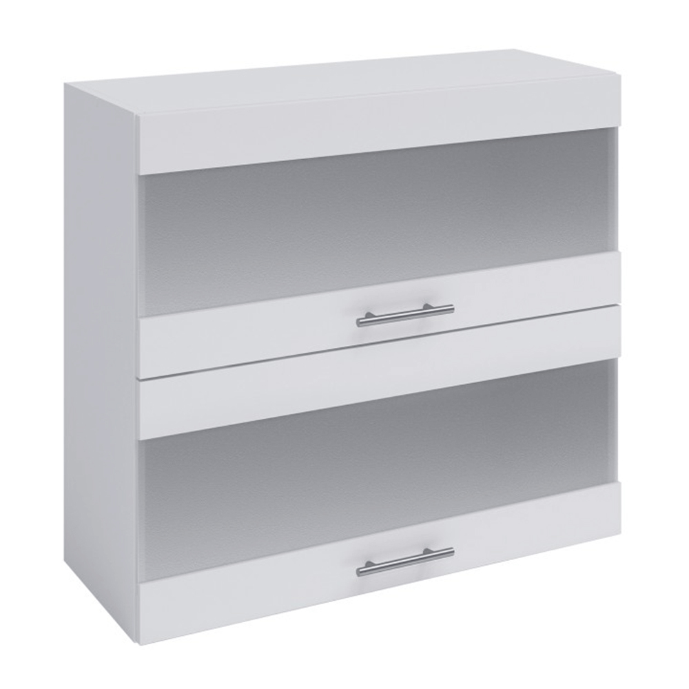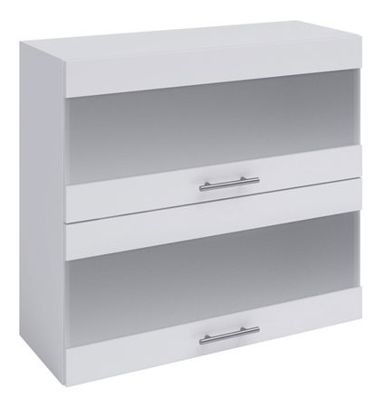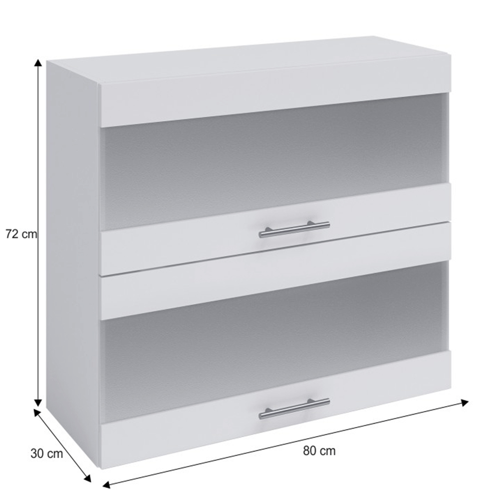 Corp superior de bucătărie cu o lățime de 80 cm echipată cu două uși pliante, care se deschid prin balamale într-un stil modern de închidere silențios. Ușa din față glazurată este folosită din sticlă clară. Mânerele sunt din metal.