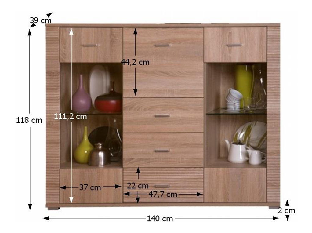 Comodă largă de trei piese. În partea superioară sunt sertare în partea de sus, sub care sunt două rafturi separate printr-un raft de sticlă, iar un sertar este situat în partea de jos. În centru există o bară deschisă în partea superioară și există 3 sertare sub ea.