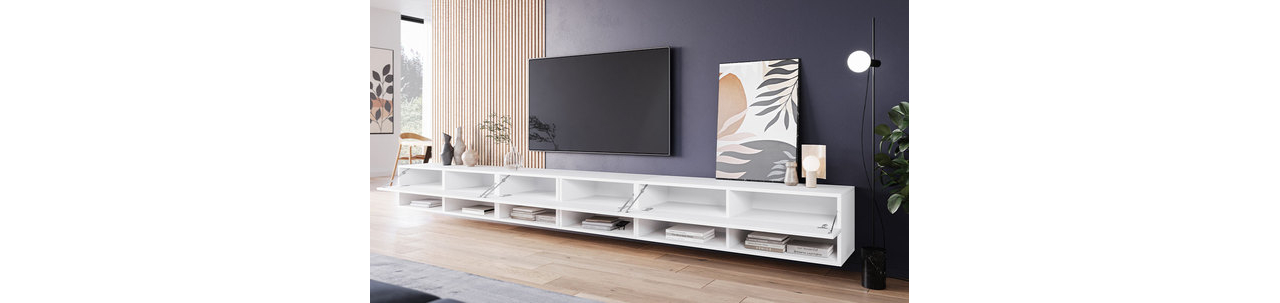 O soluție modernă și funcțională pentru orice living spațios, cu o lățime impresionantă de 300 cm, această piesă de mobilier devine punctul central al unui colț media bine organizat, oferind suficient spațiu pentru televizor, console, boxe și alte accesorii multimedia. Finisajul alb lucios adaugă un plus de luminozitate și prospețime amenajării, integrându-se perfect în interioare contemporane, minimaliste sau scandinave.