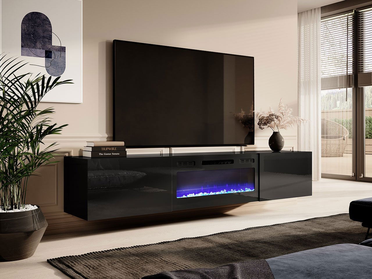 Dulap TV de perete cu șemineu Kedy 200 (Negru + lucios negru)