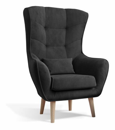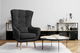 AfișeazăFotoliu cu urechi creat pentru relax și odihnă. Este pe picioare înalte din lemn. Tapițat cu textul Monolit.