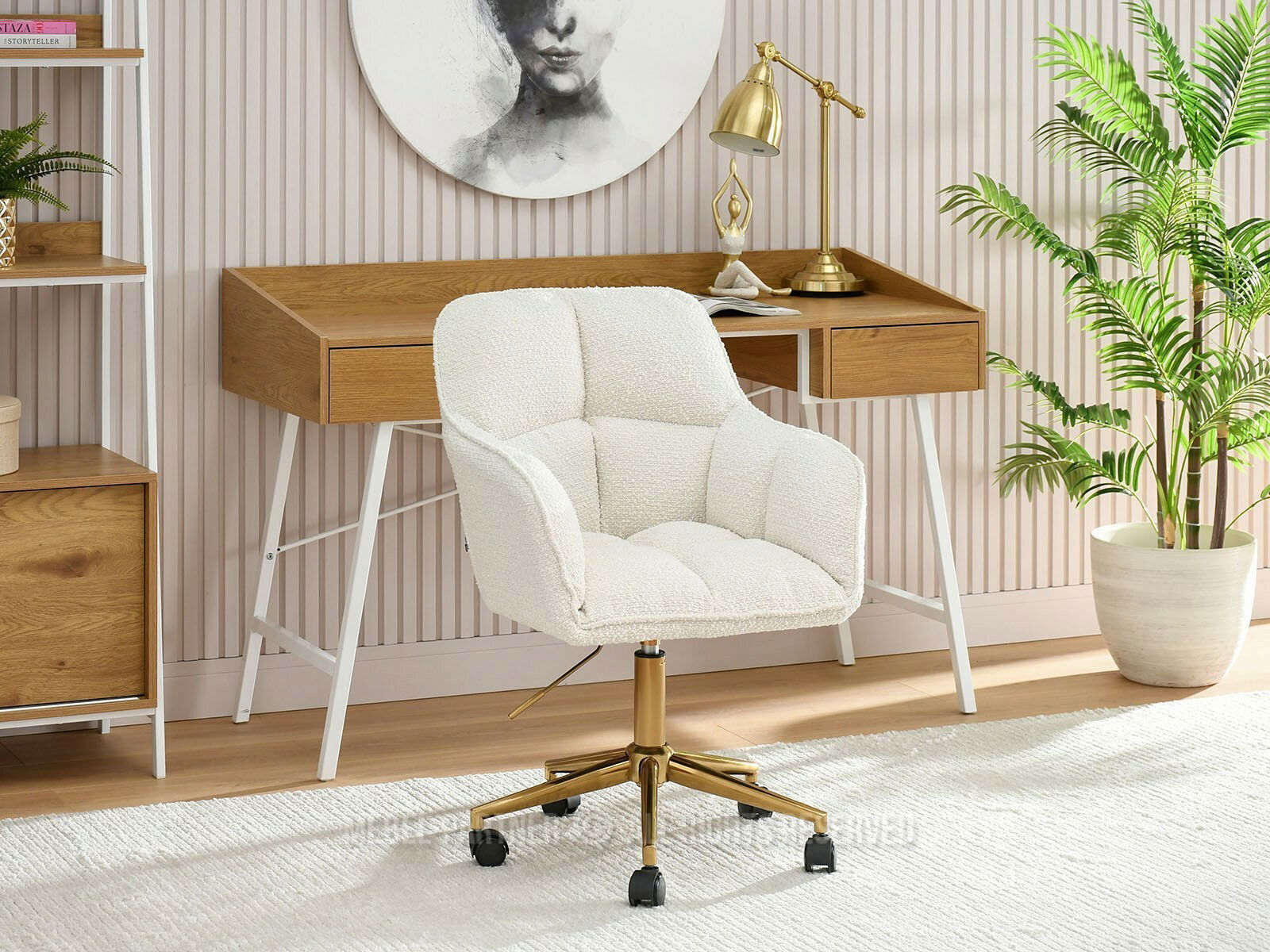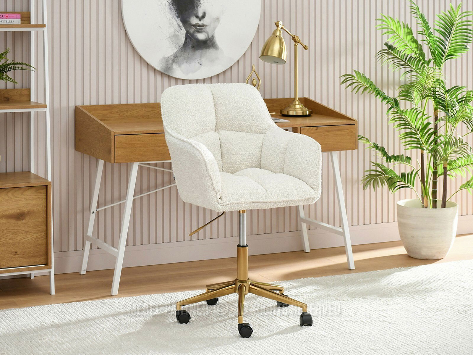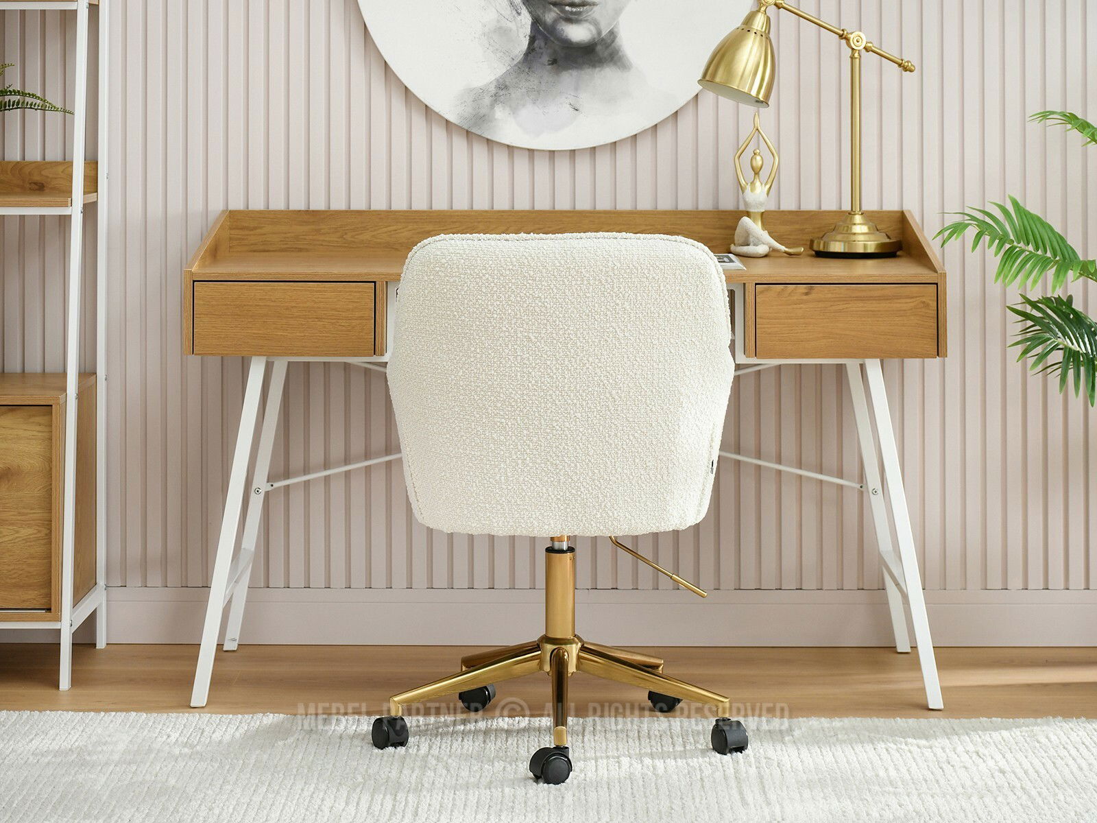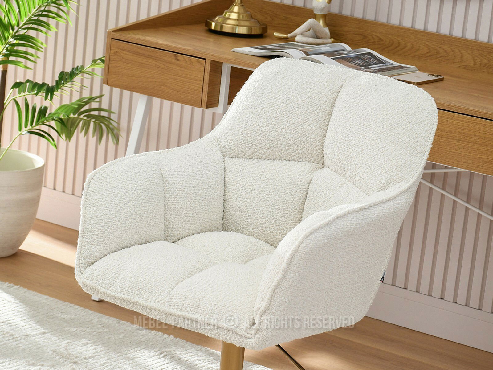 Descoperă confortul suprem și stilul rafinat cu fotoliul Island, un mobilier esențial pentru birou sau zona de relaxare. Tapițeria sa crem, din material texturat, adaugă o notă caldă și primitoare oricărui decor interior, în timp ce baza din metal auriu lucios și roțile negre îi conferă o funcționalitate modernă și mobilitate excelentă.