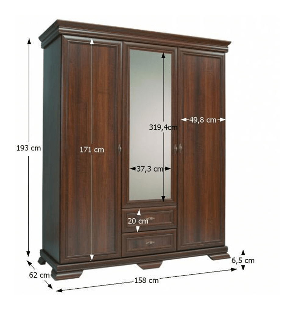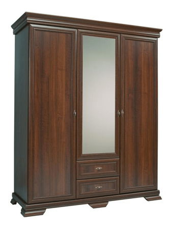 Dulap de haine spațios Kraz cu rafturi în stil rustic. Există uși pe margini, în partea de mijloc există o ușă cu oglindă și două sertare. Dulapul are picioare decorative, sculpturi și mânere metalice pe ușile și sertarele. Acesta va fi o bijuterie elegantă și unică în dormitorul dvs. Îl livrăm în culoarea elegantă King Samoa.