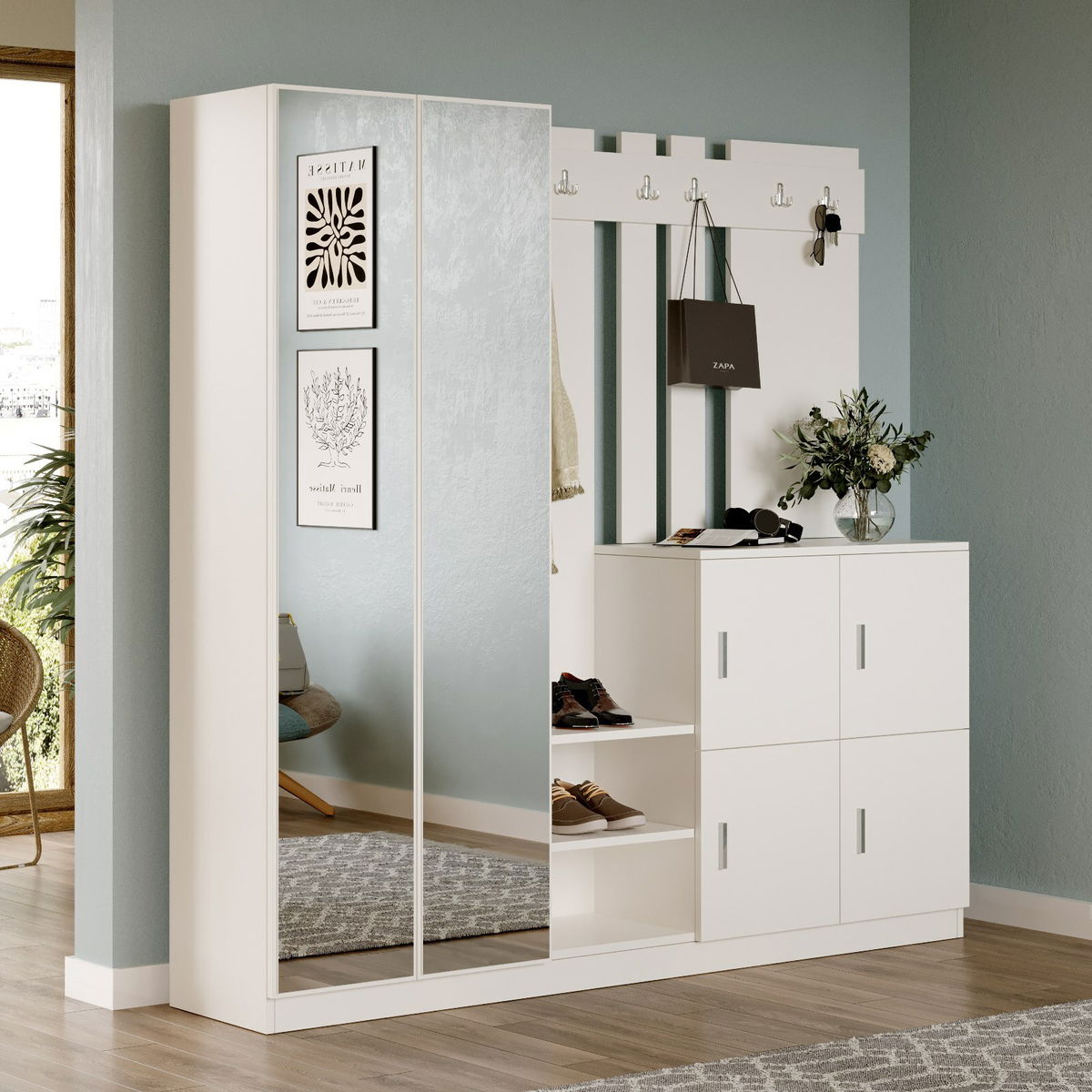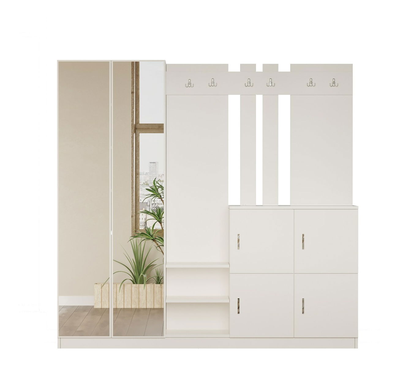 Această colecție de mobilier pentru hol aduce un plus de funcționalitate și organizare spațiului de la intrare, fiind potrivită pentru orice locuință modernă. Setul Mobilierul pentru hol Dustin 9, finisat într-un alb pur, oferă o combinație inteligentă între dulapuri spațioase, rafturi deschise pentru depozitarea încălțămintei și cuier cu multiple cârlige pentru haine, genți sau accesorii. Toate aceste elemente sunt integrate armonios pentru a maximiza capacitatea de stocare.