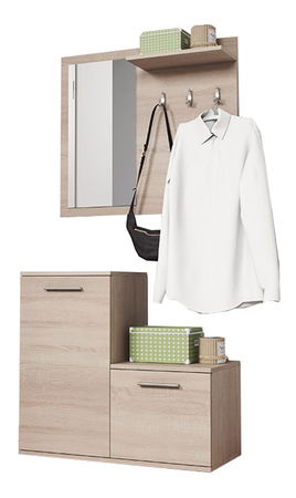Setul pentru hol MIDL va aduce ordine și zâmbet în casa voastră. Este fabricat din pal laminat cu margini din ABS în culoarea stejarului sonoma. Oferă spațiu de depozitare sub forma a două dulapuri, panou cuier, un raft și oglindă.