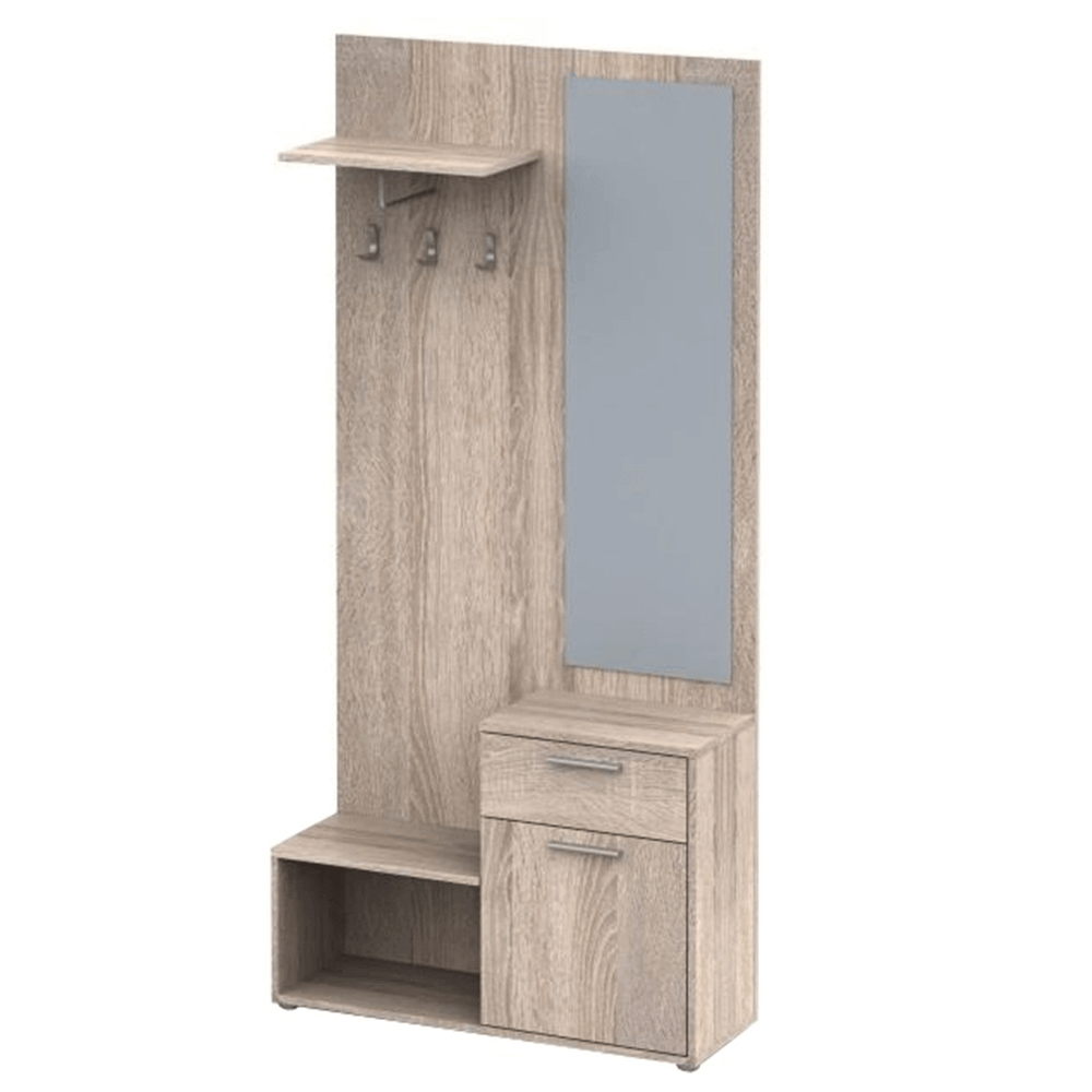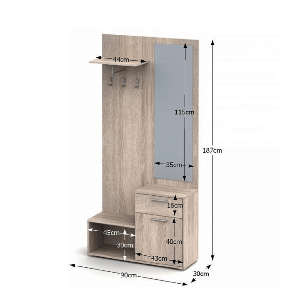 Mobilier pentru hol care oferă suficient spațiu de depozitare. Conține raft de depozitare, umerase pentru haine, oglindă înaltă îngustă, sertar, dulap și pantofar deschis. Este fabricat din pal laminat de înaltă calitate cu grosimea de 1,6 cm.