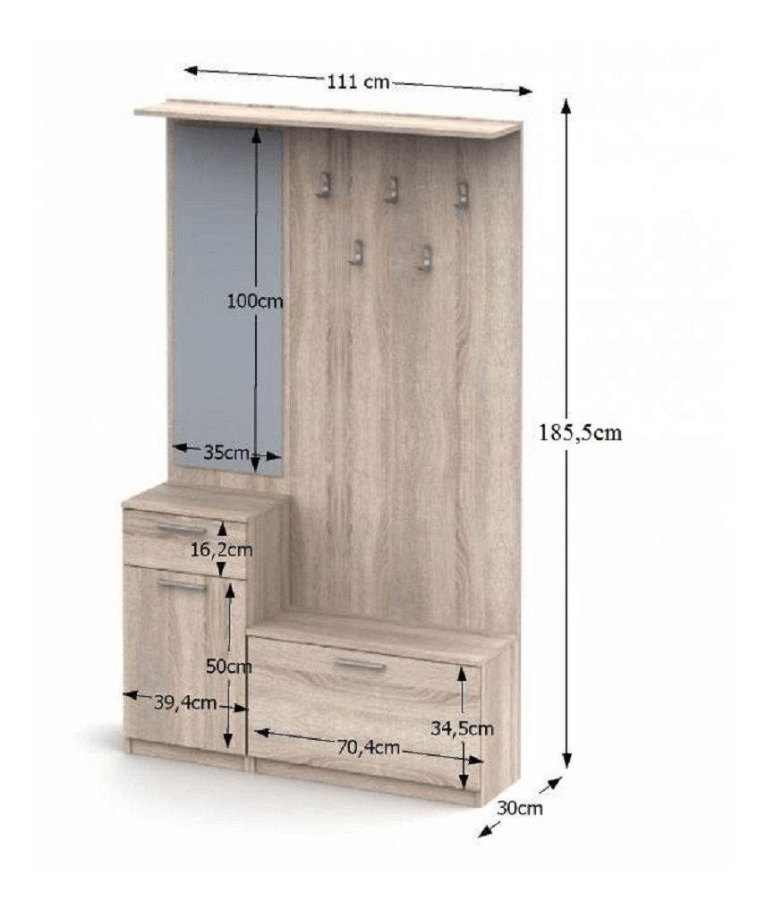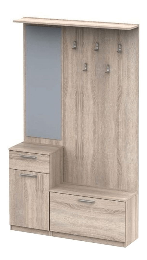 Set practic pentru hol care conține cinci cârlige, o oglindă înaltă îngustă, un sertar și pantofar. Produsul este fabricat din pal laminat de înaltă calitate cu grosimea de 1,6 cm.