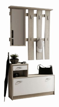Setul de hol în combinația de culori a stejarului sonoma și culoarea albă. Dulapul este fabricat din PAL de lemn laminat cu structură internă mai groasă. Este compus dintr-un dulap de pantofi jos și larg cu o ușă. Deasupra lui pe partea stângă se află o poliță cu sertar. Deasupra lui se află o oglindă care este plasată pe cuierul suspendat în partea stângă a acestuia. Cuierul are în partea superioară o poliță.