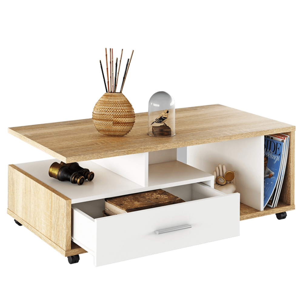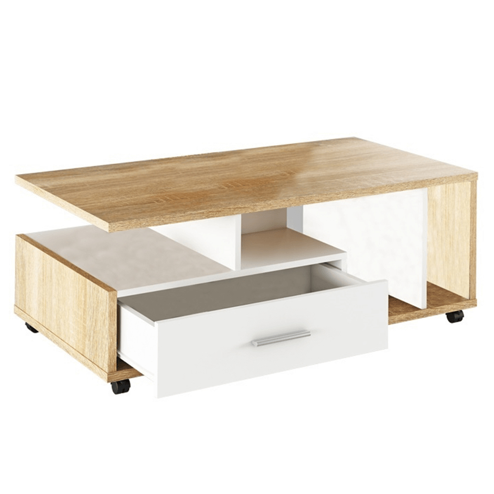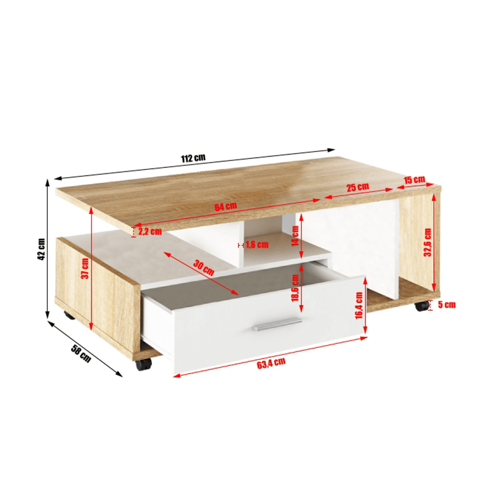 Fabricat din pal laminat în culorile stejarului sonoma și alb. Oferă suficient spațiu de depozitare sub forma unui singur sertar și spațiu de depozitare deschis. Pentru o manipulare mai ușoară are și roți.