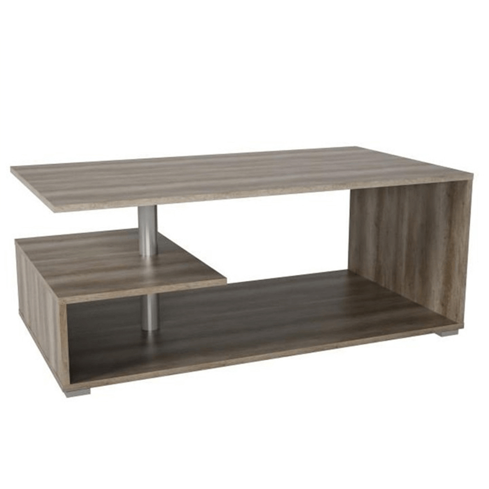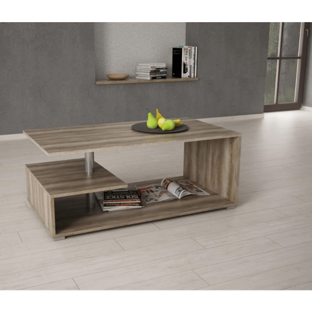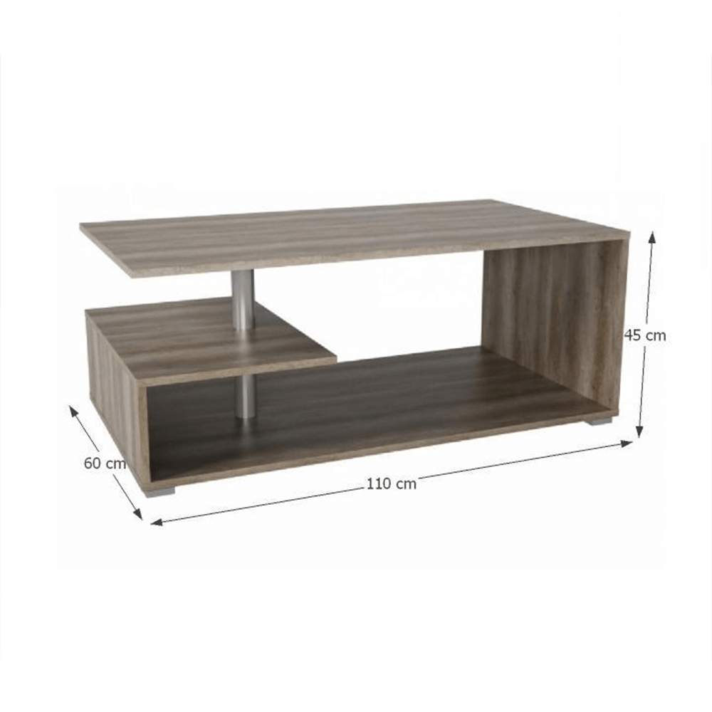 Masă de cafea cu un design frumos și modern, care va fi un accesoriu practic în interiorul casei dvs. Are două rafturi de depozitare, dintre care unul este mai mic și este conectat cu partea superioară și inferioară a mesei printr-o tijă metalică. Versiunea color este de stejar canyon.