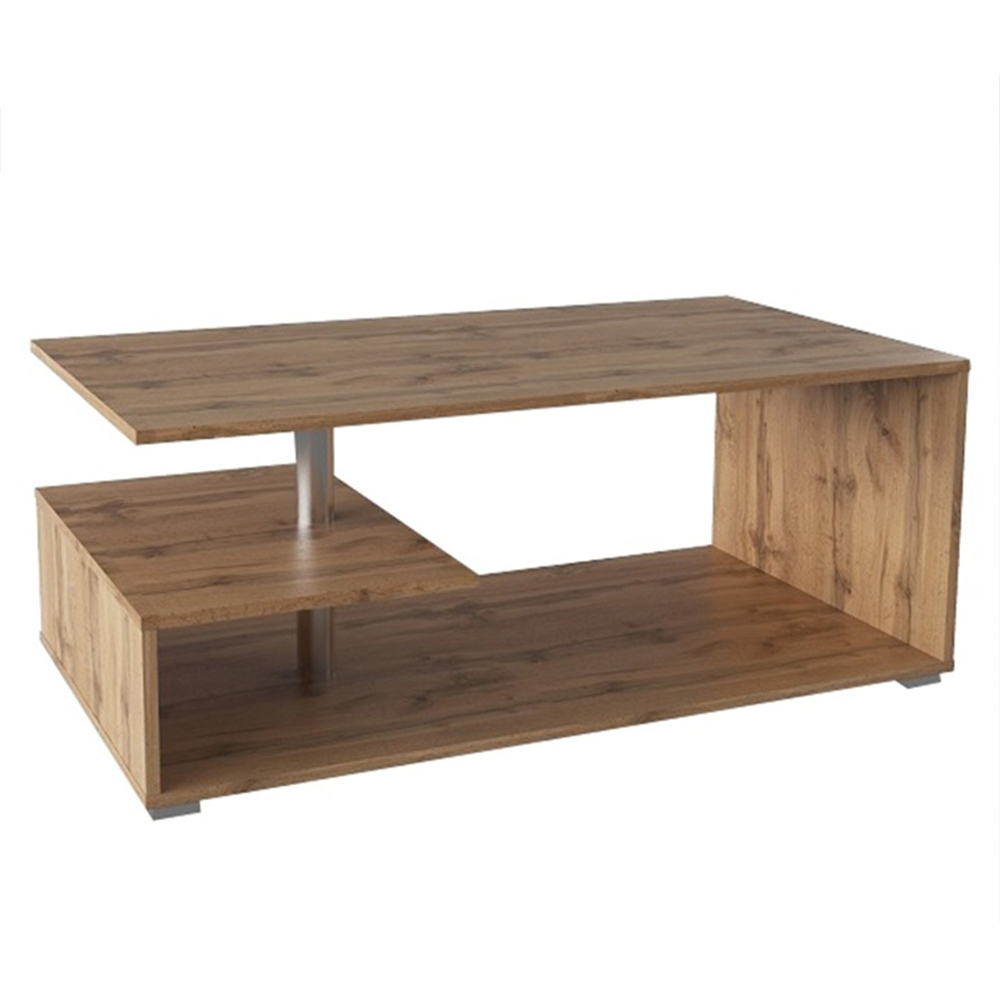 Masă de cafea cu design modern, care va fi mai ales un accesoriu practic în interiorul dvs. Are două polițe, dintre care o poliță este mai mică și este conectată cu blatul inferior și superior pintr-o tijă metalică. Masa este în versiunea color stejar wotan.