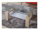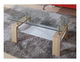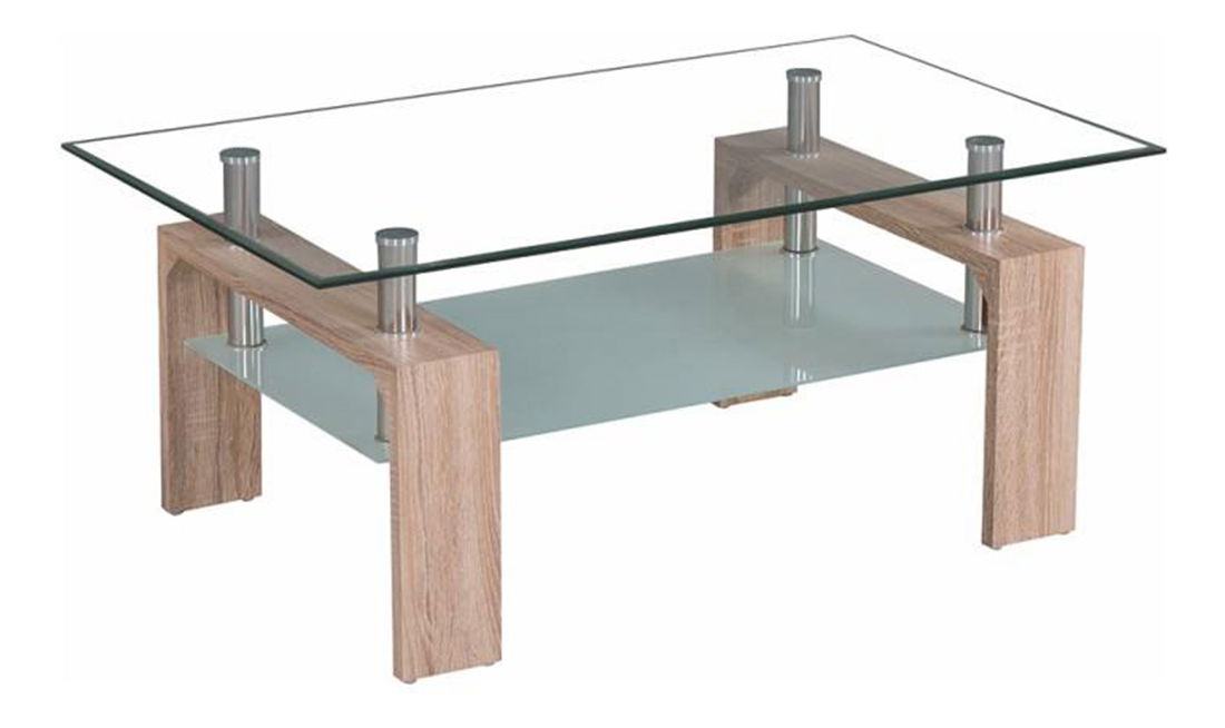 Masă de cafea elegantă și practică pe picioare în design de culoare de stejar sonoma. Sticla călită groasă de 8 mm este montată pe picioarele cromate, raftul inferior fiind din sticlă albă.