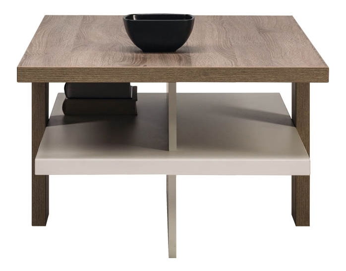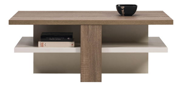 AfișeazăMăsuță de cafea interesantă cu raft de depozitare.