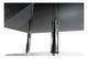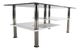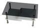 O masă de cafea cu picioarele rotunde din argint, o placa superioară de sticlă neagră și două rafturi strălucitoare albe amplasate în centru una lângă cealaltă. Rafturile medii albe sunt plasate la înălțime diferită și sunt conectate printr-un picior și conectate la placa de sticlă superioară.