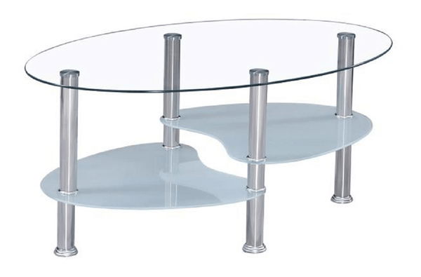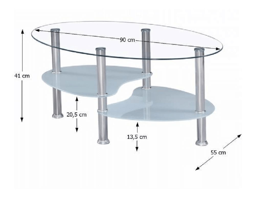 Masă de cafea Wave cu placa superioară de sticlă transparentă, care este susținut de patru picioare din oțel. Rafturile inferioare de depozitare sunt împărțite în două părți și sunt fabricate din sticlă nisipie.