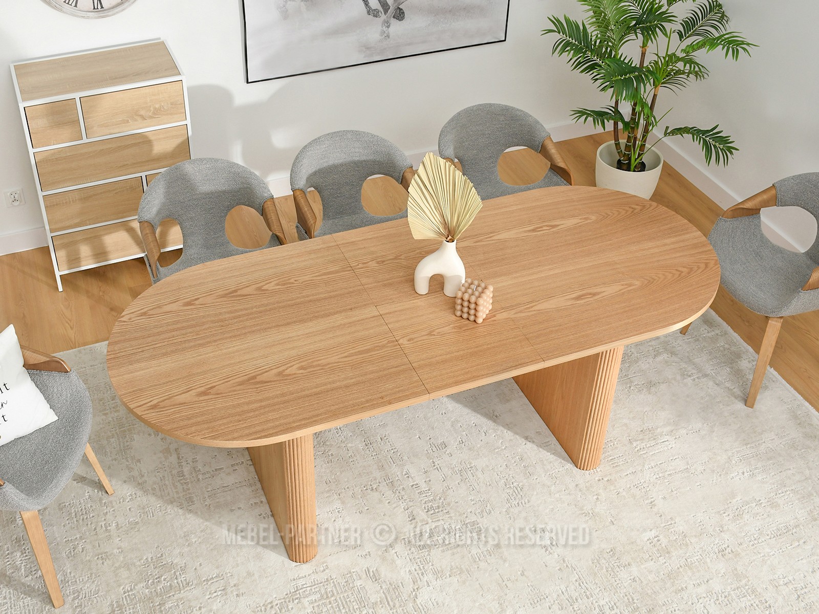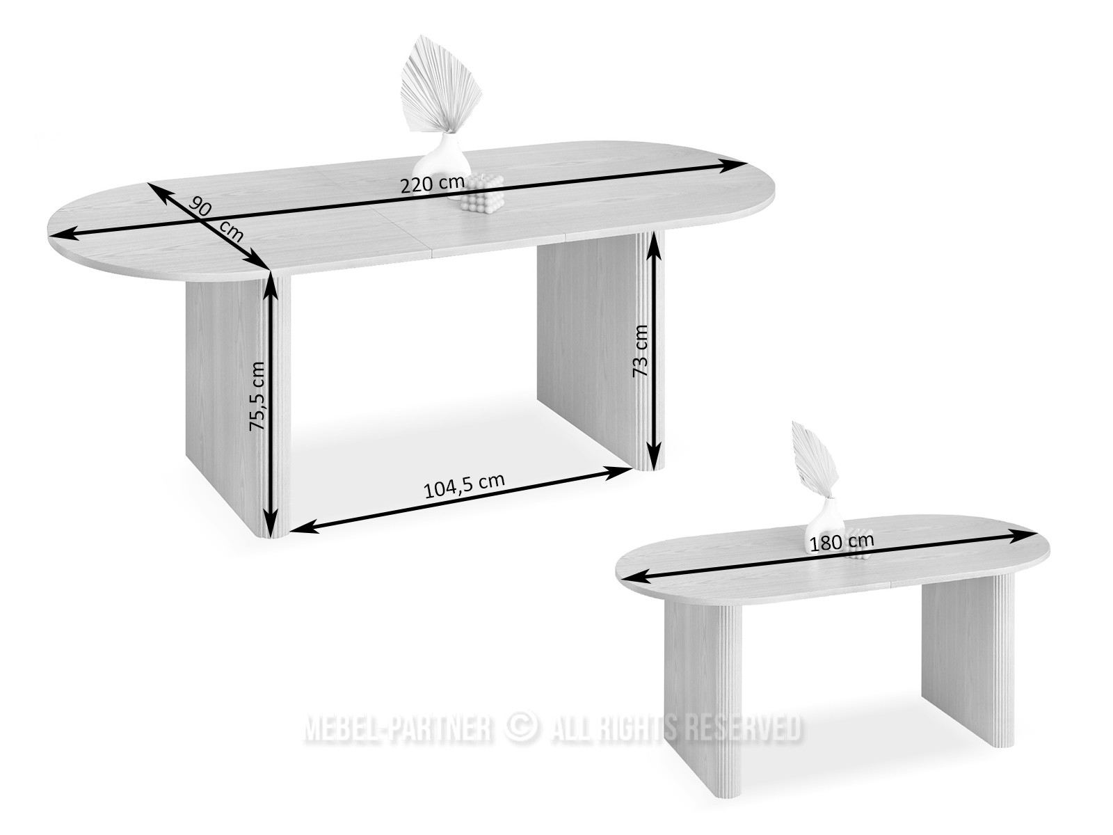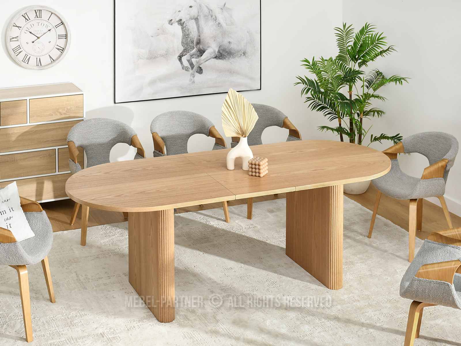8 locuri, extensibilă, partea superioară ovală, bază cu 2 picioare