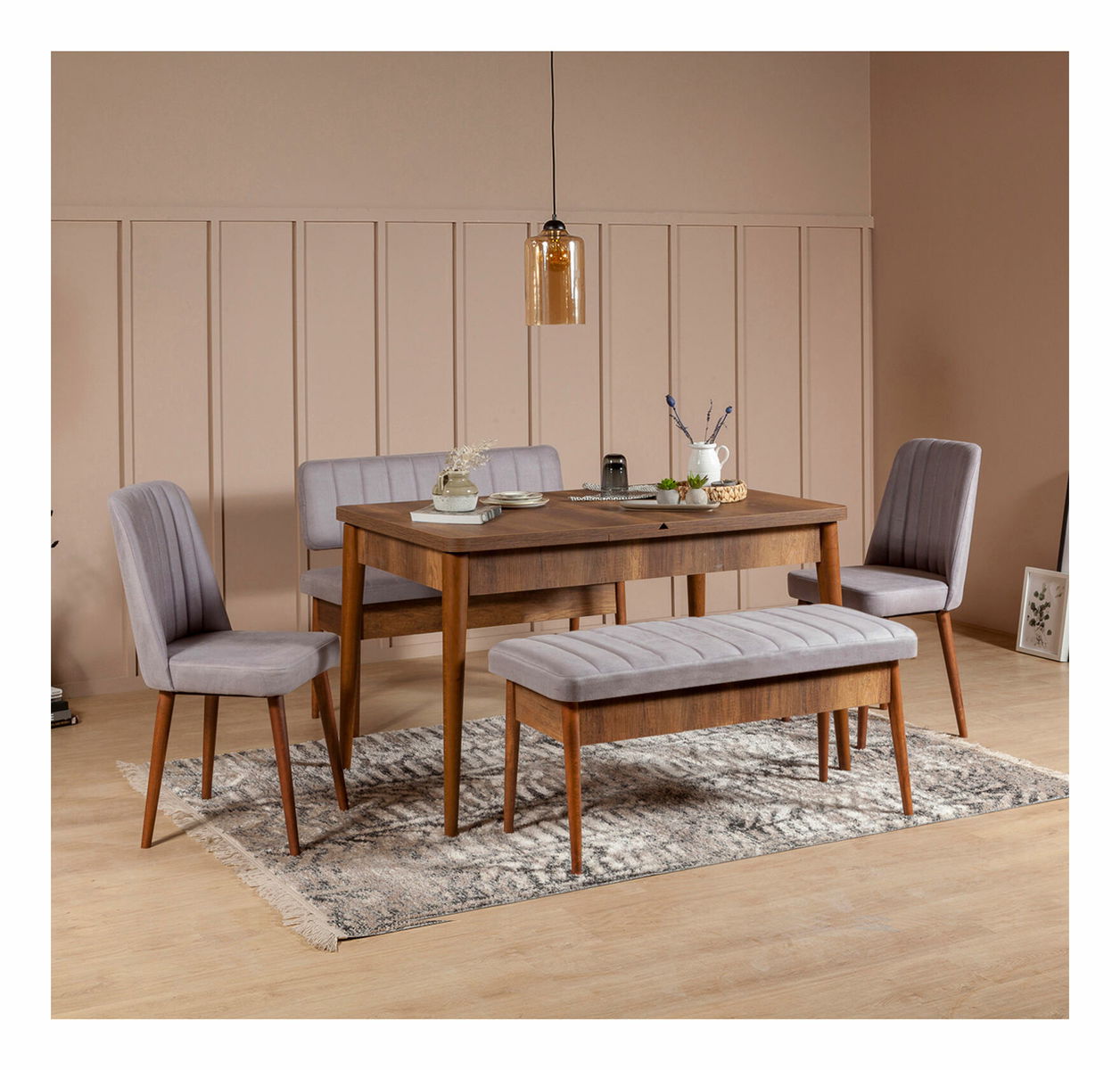 Masă de sufragerie extensibilă cu 2 scaune și 2 bănci Vlasta (nuc + gri)