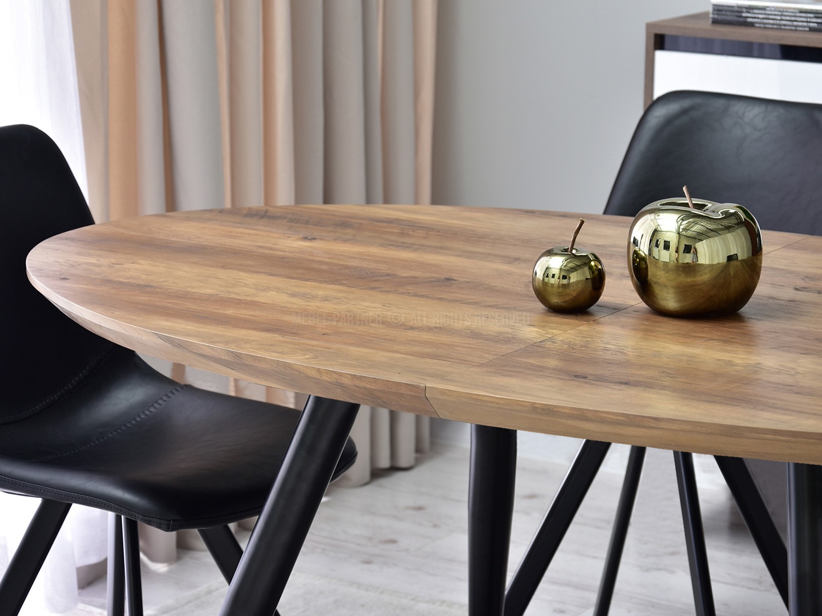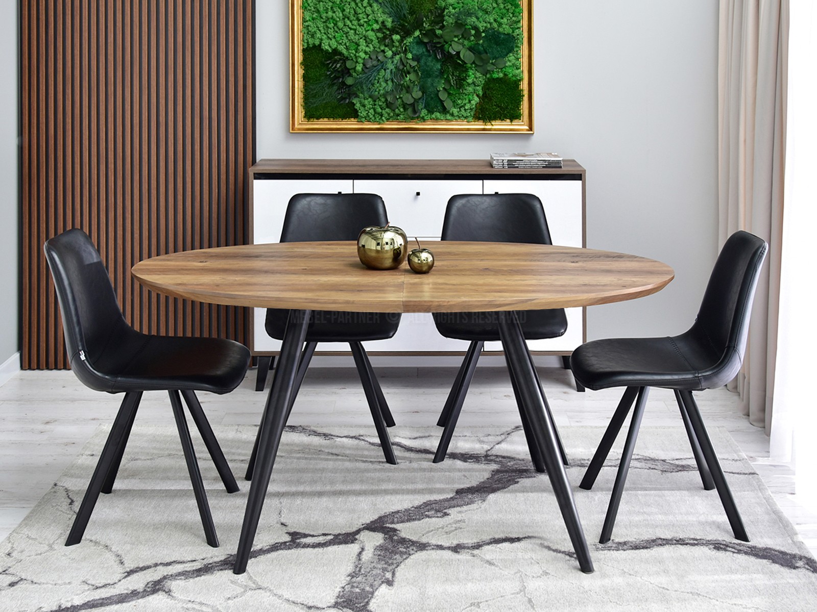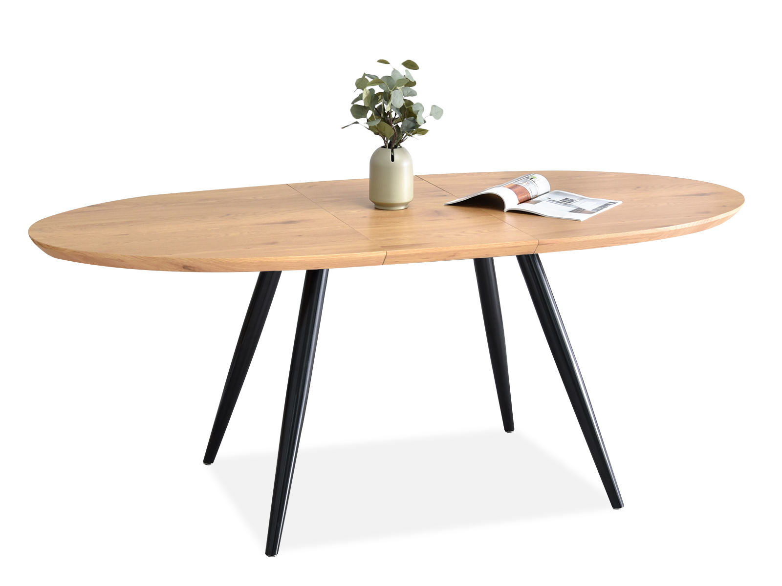 8 locuri, partea superioară ovală, bază cu 4 picioare, extensibilă