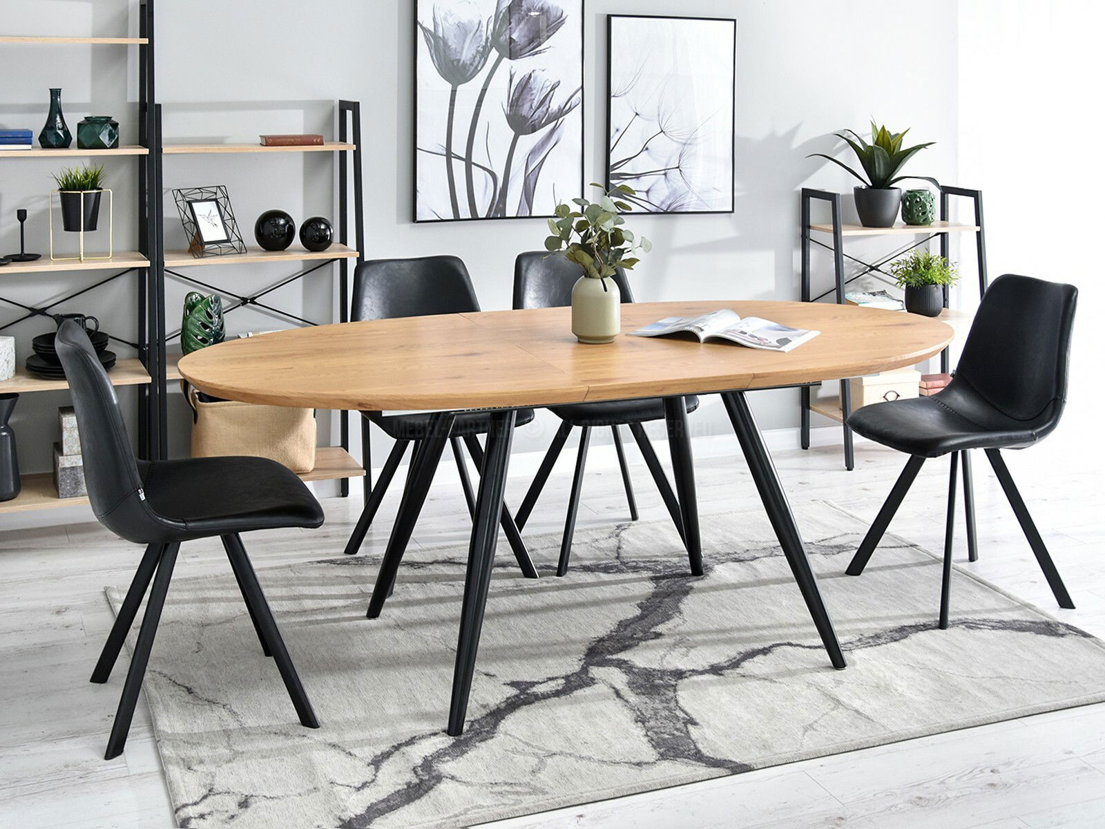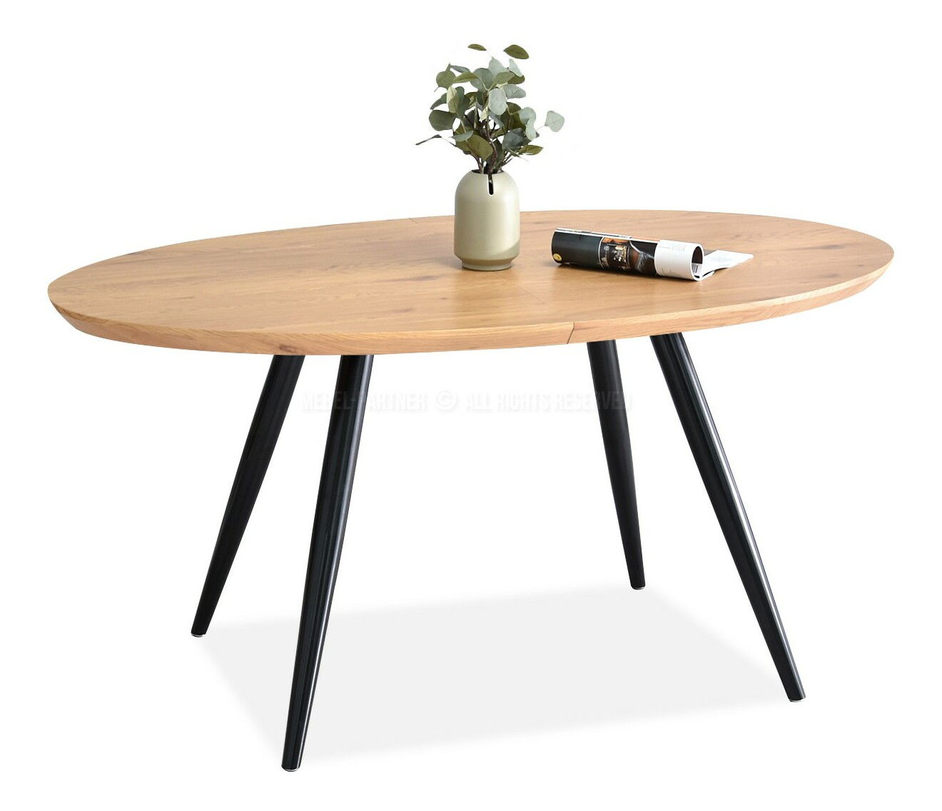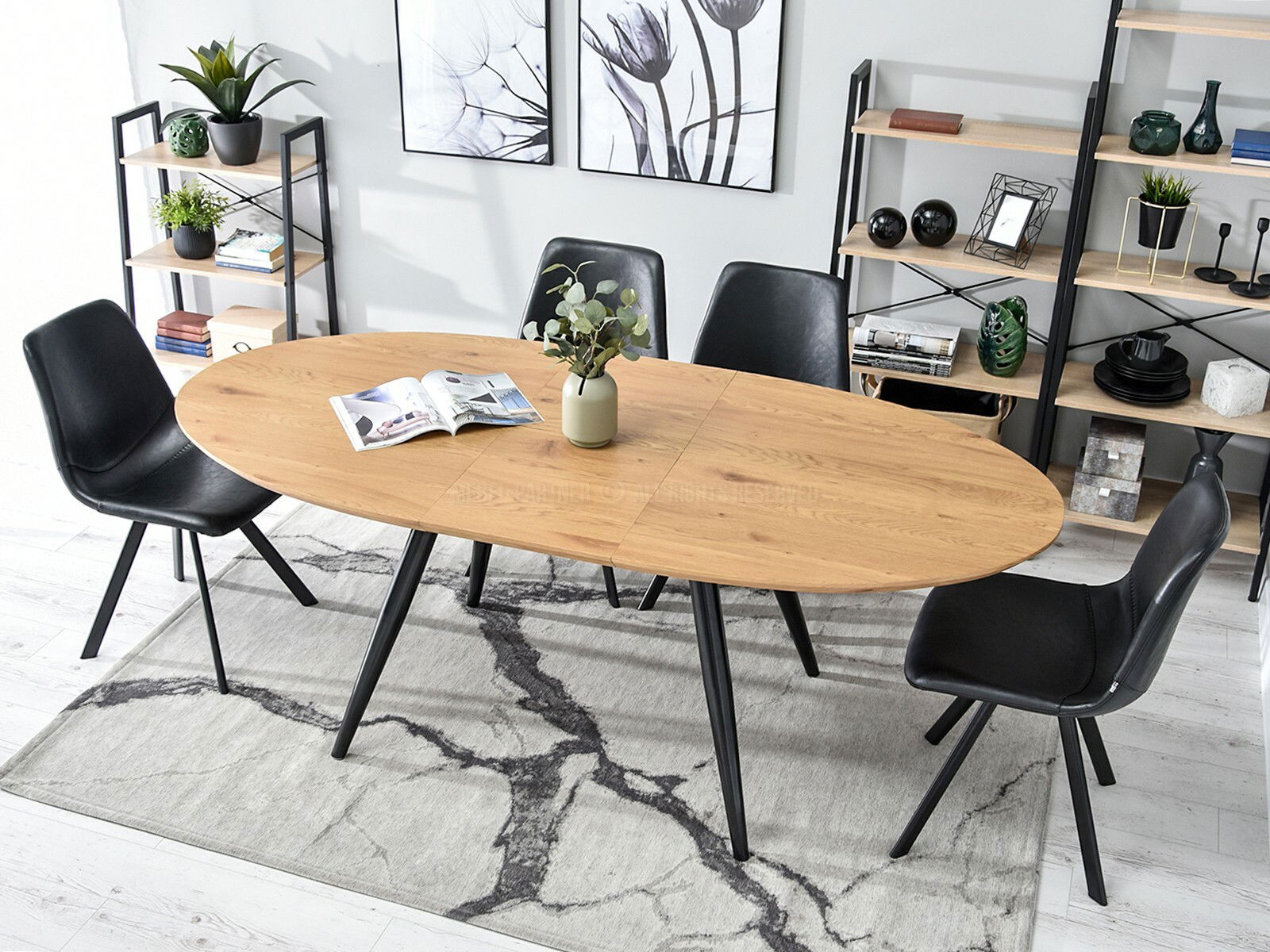 8 locuri, partea superioară ovală, bază cu 4 picioare, extensibilă
