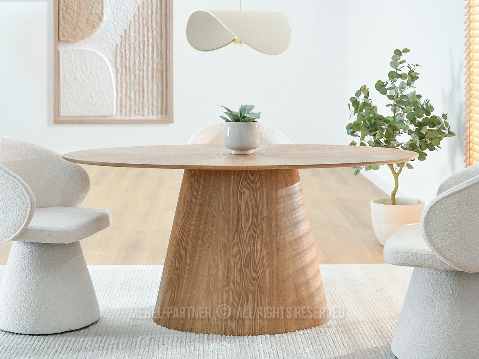 Blatul oval și suportul robust, cu formă conică, oferă stabilitate și un aspect distinct, făcând această piesă potrivită pentru mese în familie sau întâlniri cu prietenii.