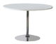 Masă de bucătărie elegantă în formă rotundă, potrivită în săli de mese mai mici întunecate și în bucătării. Placa superioară este din lemn în nuanța albă lucioasă, iar piciorul mesei și baza inferioară sunt cromate.