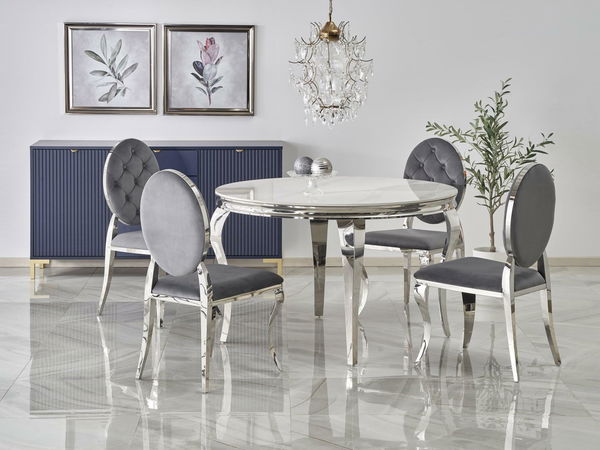 Masa Regino se adaptează ușor diverselor stiluri de interior, fie că este vorba despre un decor minimalist, clasic sau un stil eclectic cu accente metalice. Designul său sofisticat este completat armonios de scaunele cu tapițerie din catifea gri și structura argintie, creând un ansamblu de mobilier de sufragerie cu personalitate elegantă.
