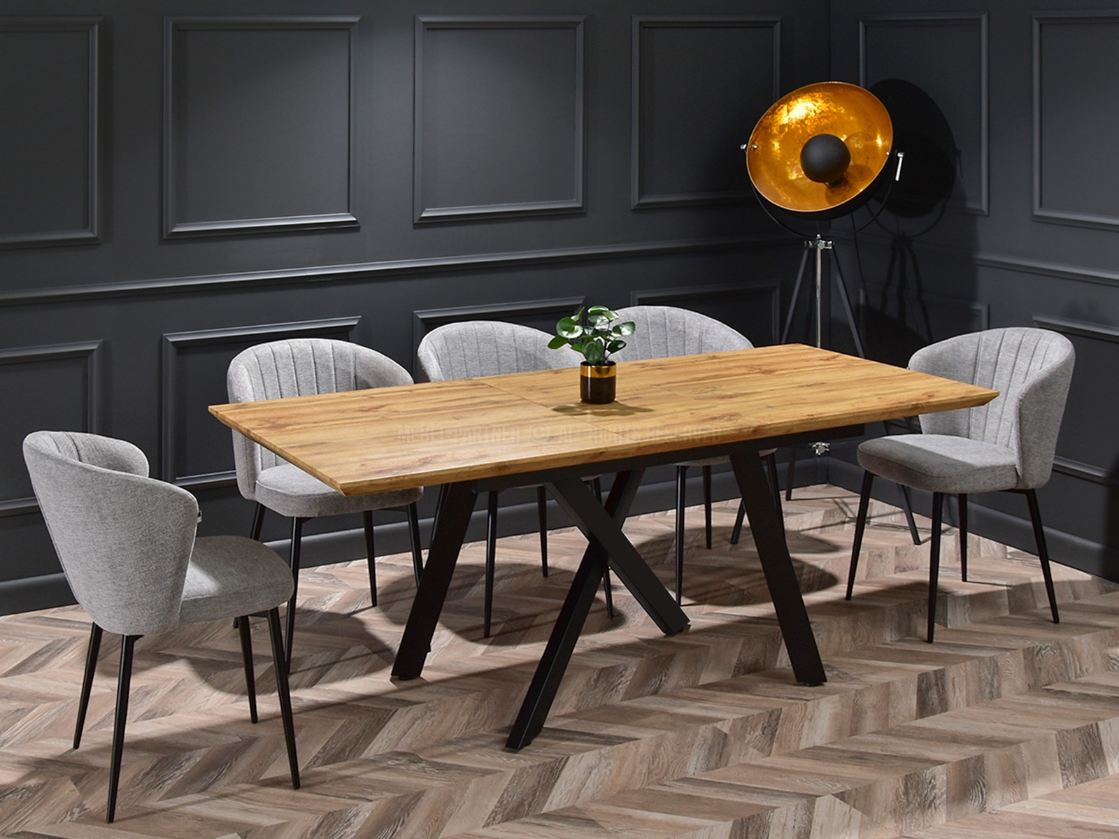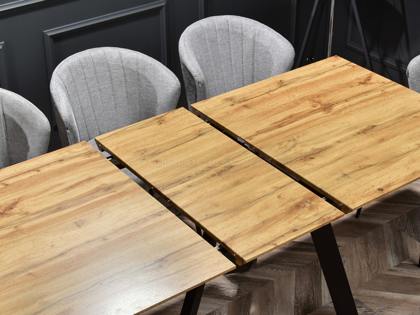 6 locuri, partea de sus dreptunghiulară, bază cu 4 picioare, extensibilă