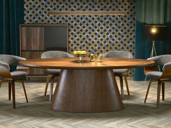Masa de sufragerie Vaner este esențială pentru orice living sau dining modern, concepută să găzduiască confortabil opt și mai multe persoane. Realizată cu atenție din MDF și placată cu furnir natural de nuc, această masă rotundă cu blat oval impresionează prin textura sa caldă și aspectul luxos. Picioarele conice robuste susțin ferm structura și adaugă un aer contemporan, integrându-se perfect în interioare scandinave, clasice sau industriale.