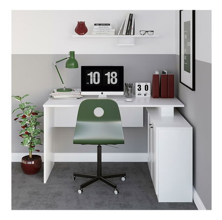 grosime: 18 mm, dimensiuni masă pentru studii: lățime: 130 cm, înălțime: 74 cm, adâncime: 60 cm, dimensiuni raft lateral: lățime: 28 cm, înălțime: 62 cm, adâncime: 90 cm