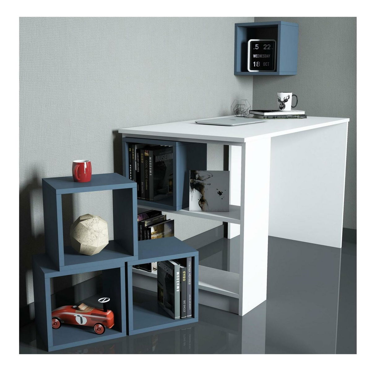 - Masă PC cu raft Babar (Alb + albastru)