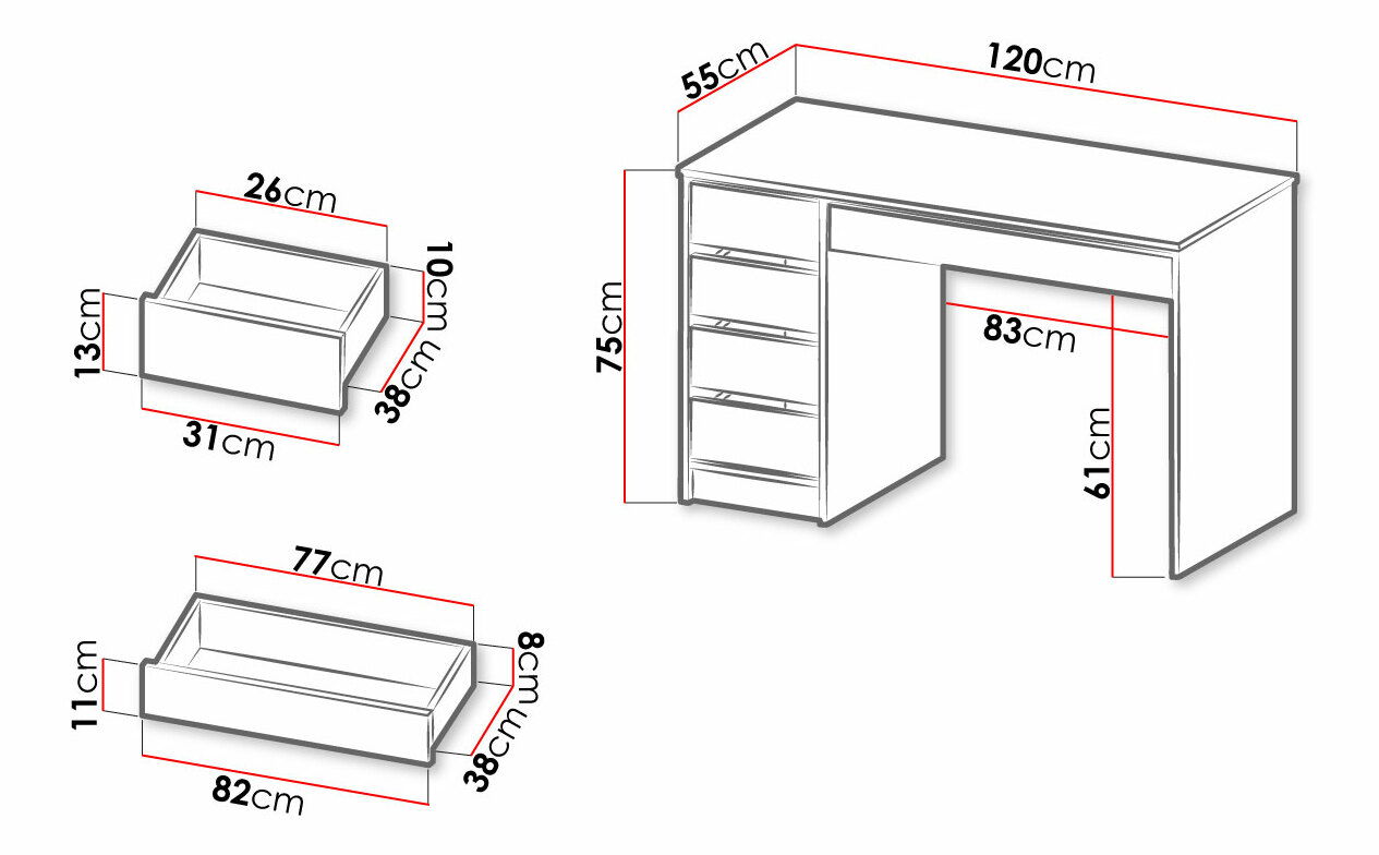 elülső rész és a korpusz 16 mm-es laminált forgácslapból - ellenáll a nedvességnek és a karcolásnak, test ABS éllel, magasfényű fiókelőlapok vezetősíneken, fogantyú nélküli rendszer, univerzális asztal - a fiókok balra vagy jobbra rögzíthetők