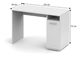 Masă de birou simplă, cu un dulap cu rafturi interioare în partea dreaptă și sertare deasupra.