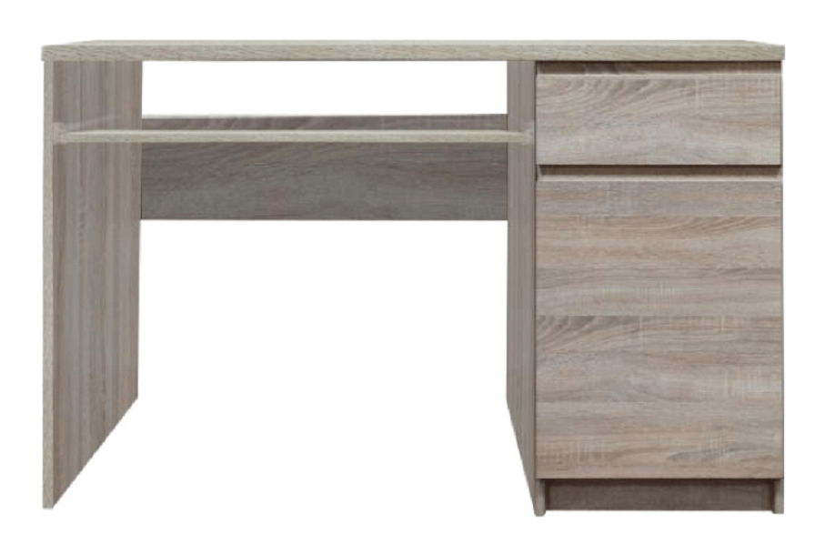 Masă de birou cu dulap și sertar deasupra acestuia, situat în partea dreaptă. Sub placa superioară este un raft glisant pentru tastatură. Materialul este laminat DTD, marginile sunt lipite cu benzi ABS, finisajul fiind lemnul de stejar sonoma.