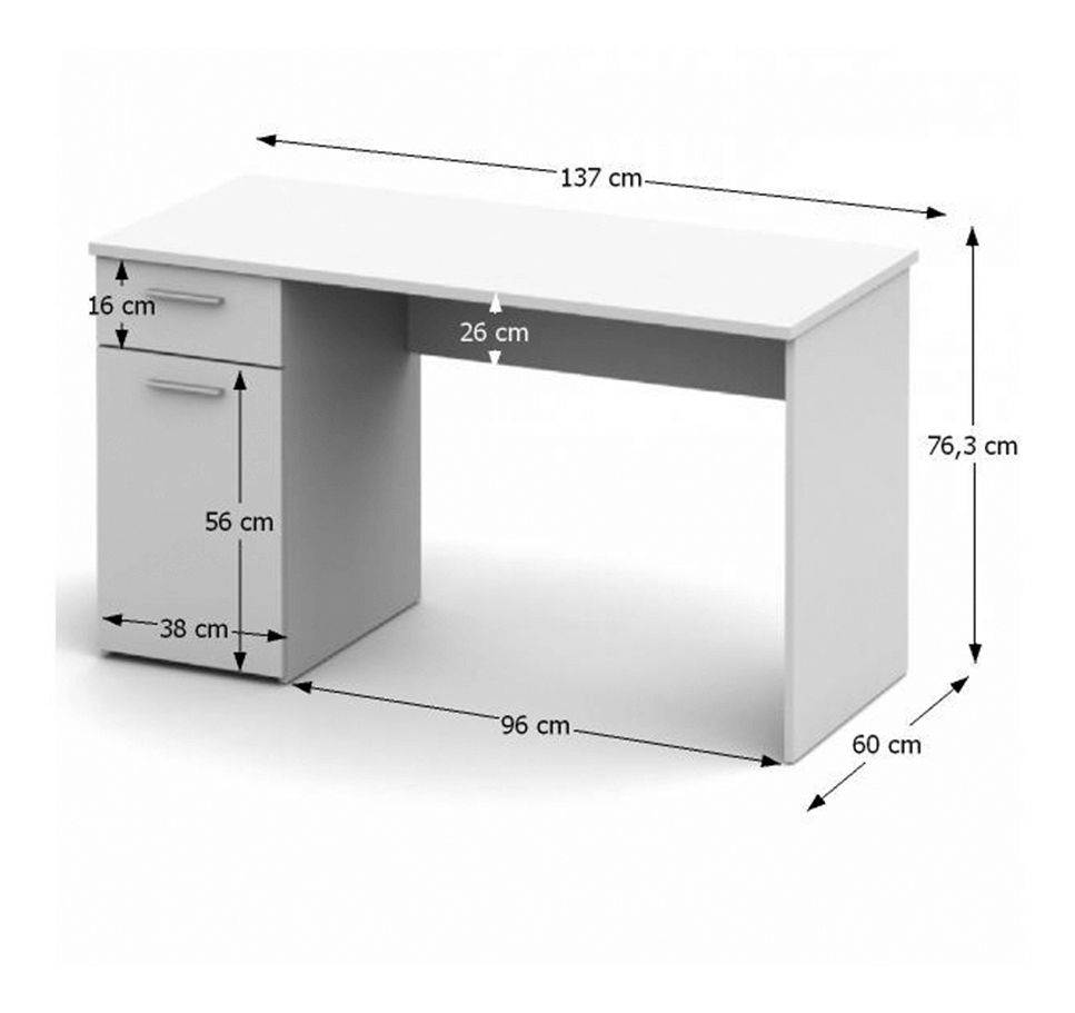 Masă PC cu spațiu de depozitare. Este echipată cu un dulap pe partea stângă deasupra căruia se află un sertar. Are mânere gri