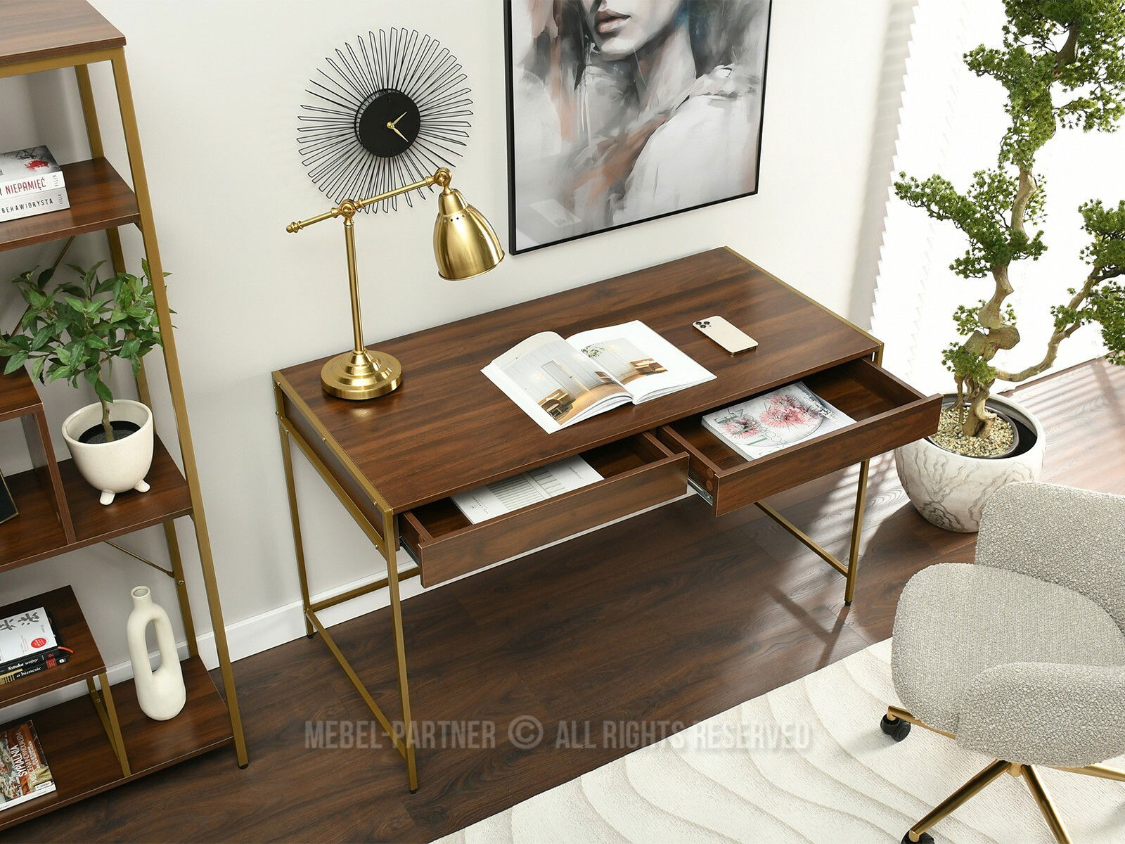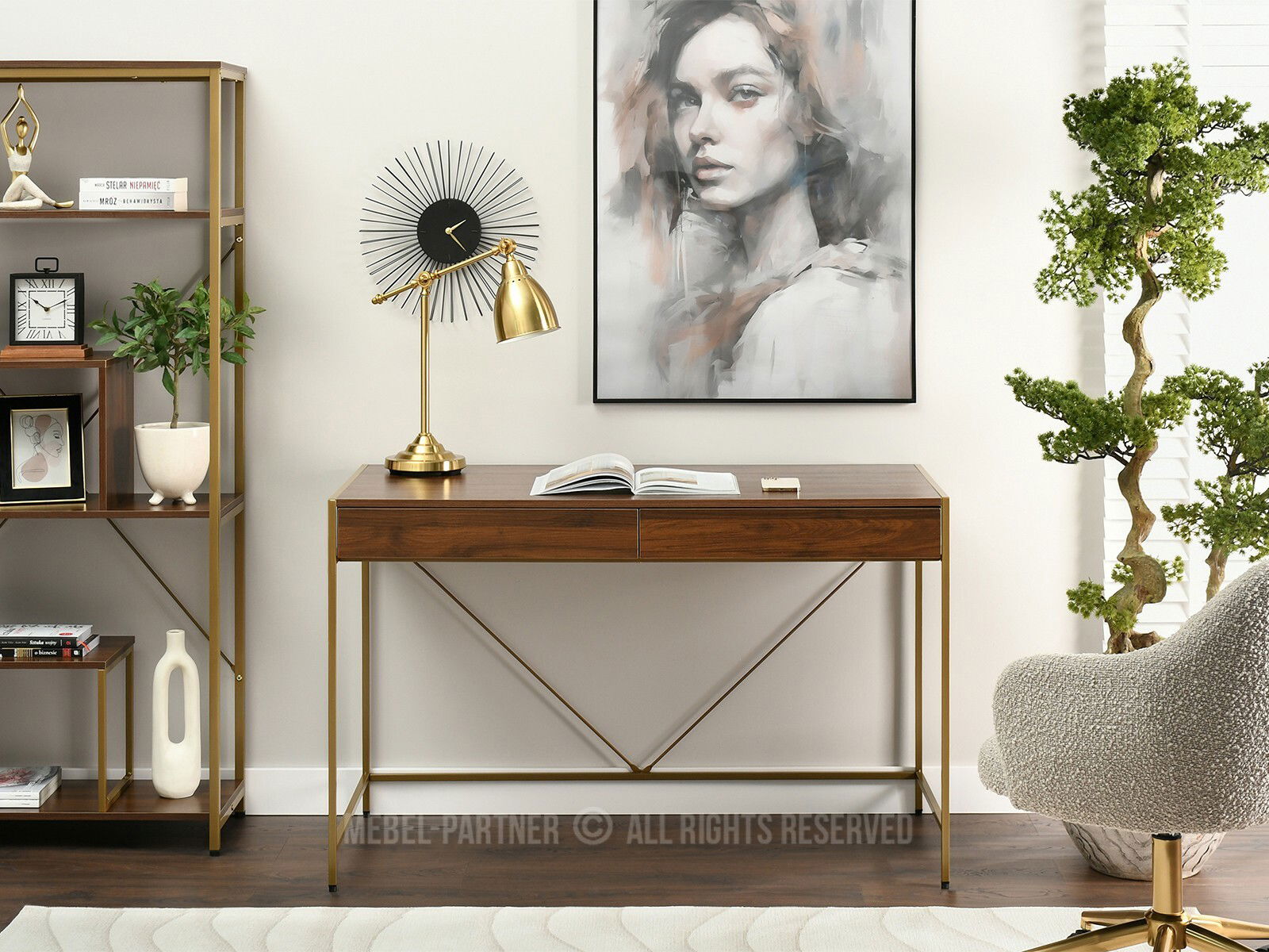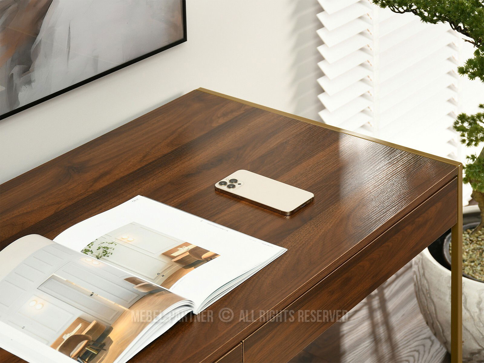 Masa PC Unica este perfectă pentru orice spațiu de lucru modern, combinând funcționalitatea cu un design atrăgător. Realizată din lemn în nuanță caldă de nuc, această piesă este completată armonios de structura metalică aurie, adăugând un aer contemporan și rafinat încăperii tale.