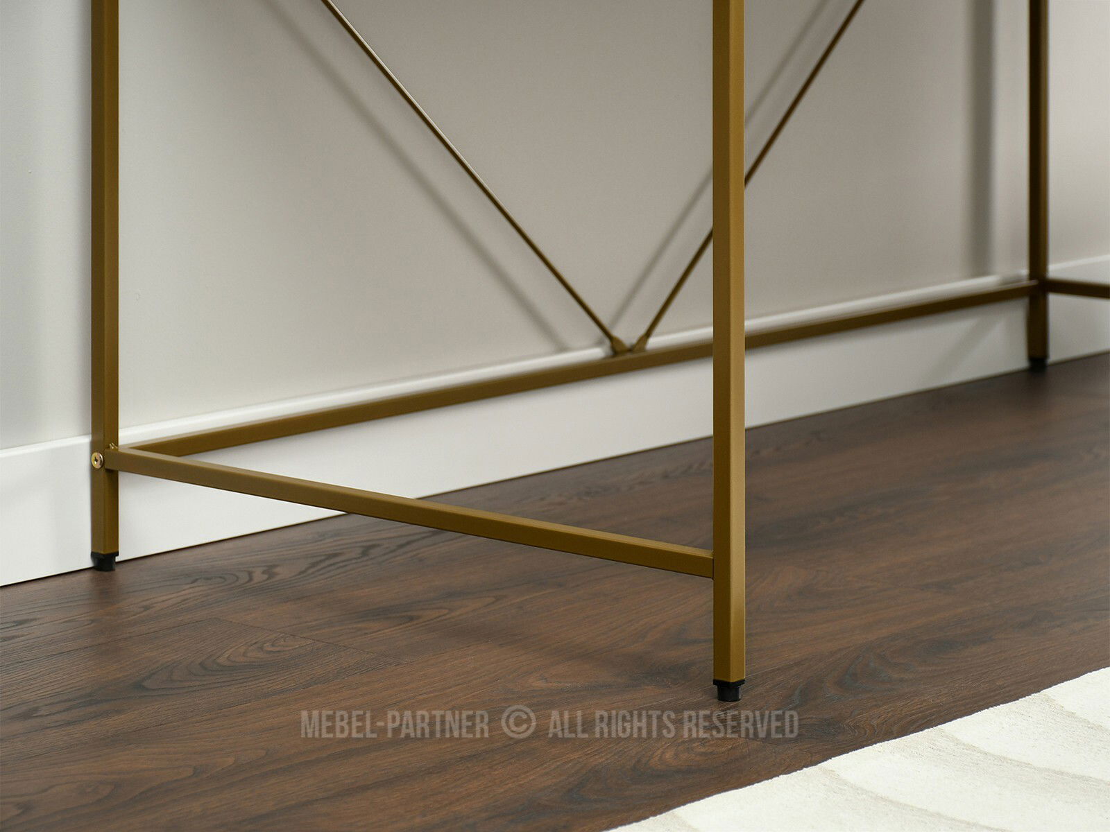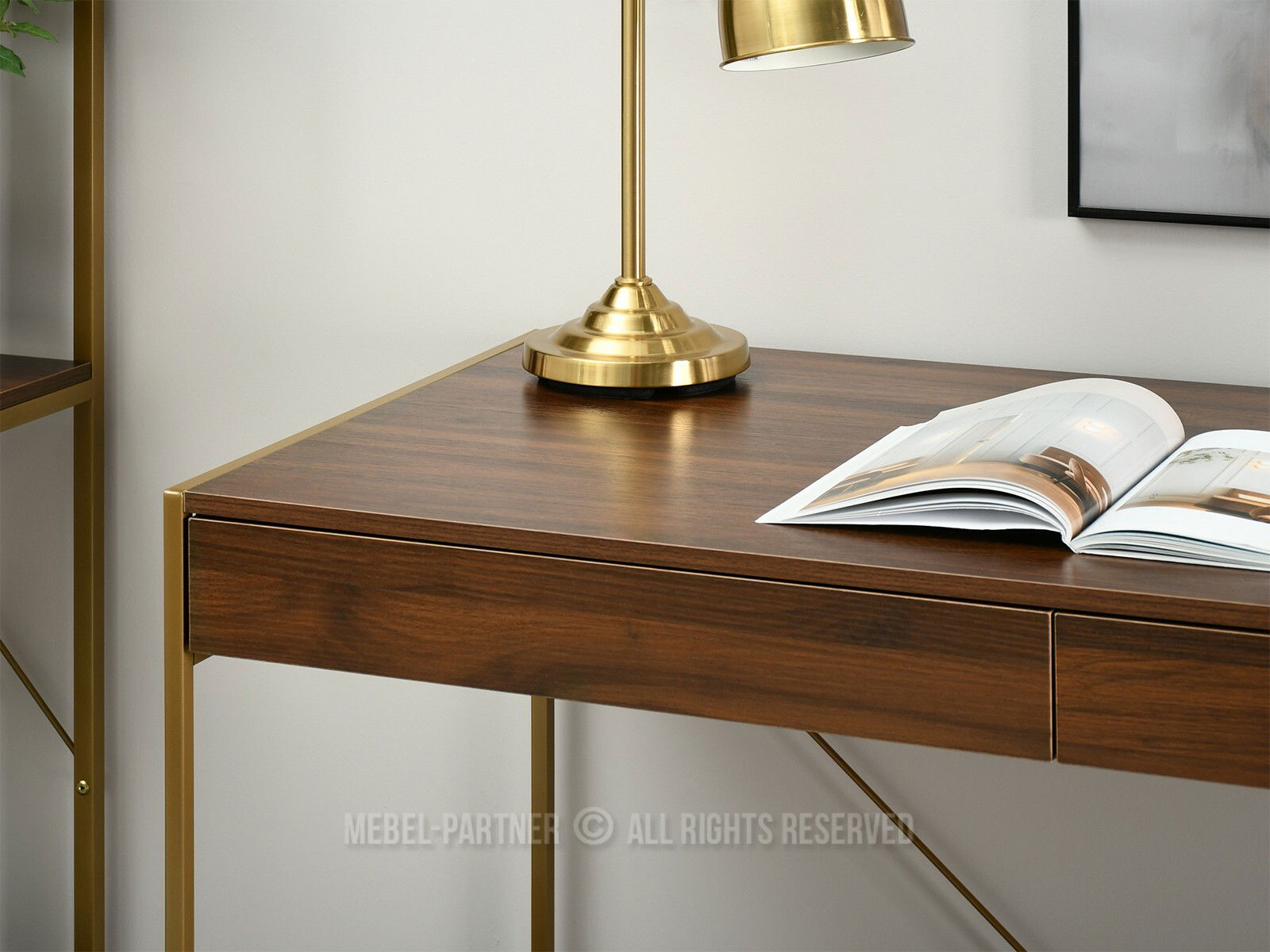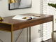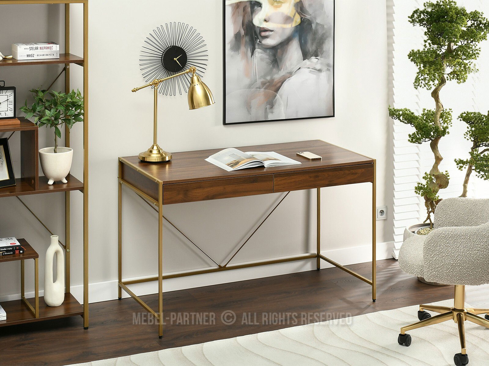 Masa PC Unica este perfectă pentru orice spațiu de lucru modern, combinând funcționalitatea cu un design atrăgător. Realizată din lemn în nuanță caldă de nuc, această piesă este completată armonios de structura metalică aurie, adăugând un aer contemporan și rafinat încăperii tale.