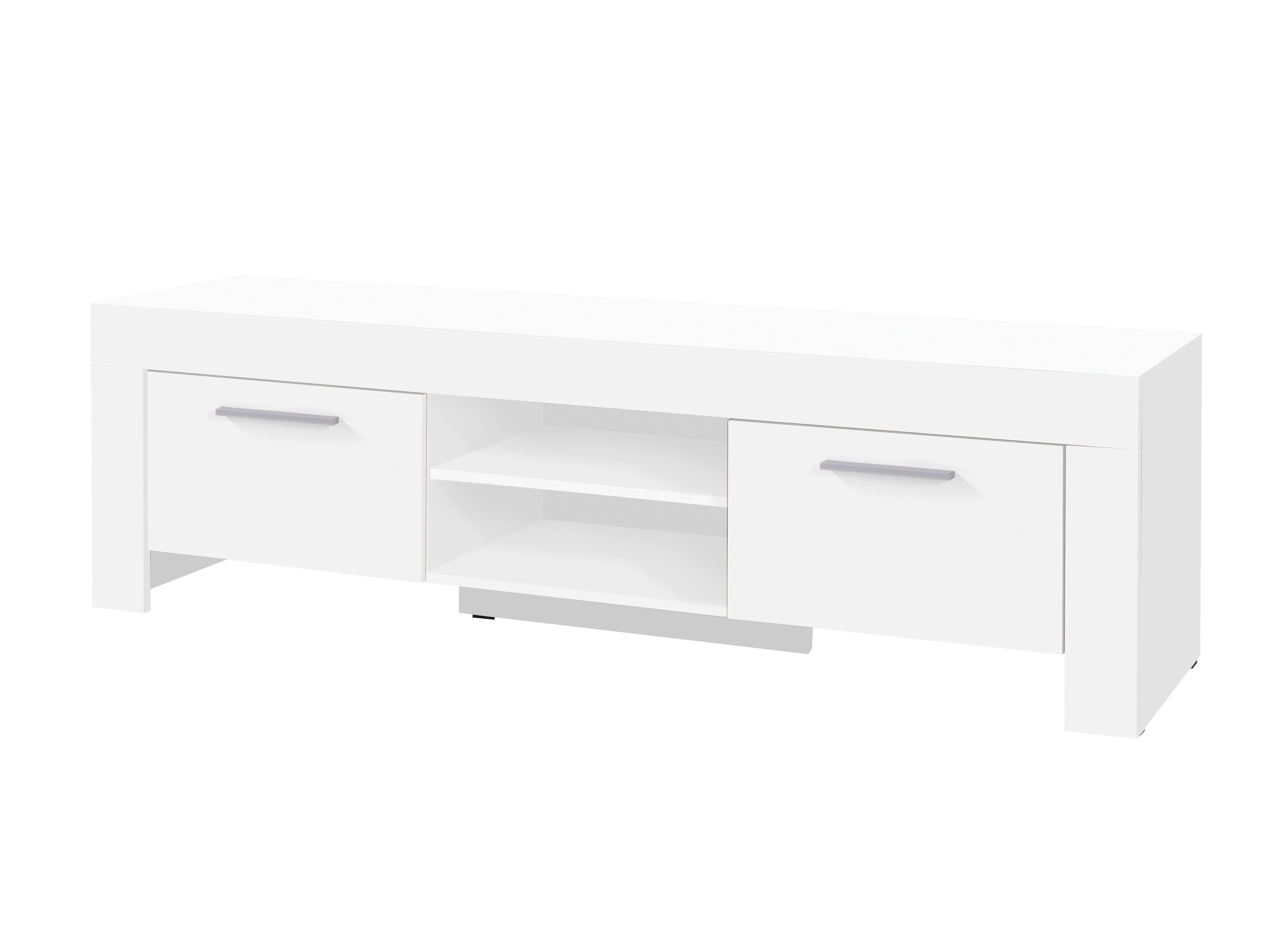 Masă elegantă pentru TV cu ecran lat, cu design masiv, cu spațiu de stocare suficient pentru colecția de DVD-uri cu filme, CD-uri cu muzică și rafturi deschise pentru echipamente audio / video. Există o ușă pe partea stângă și pe partea dreaptă a mesei. În combinație cu comodele sau dulapurile, camera de zi se transformă într-un loc plăcut.