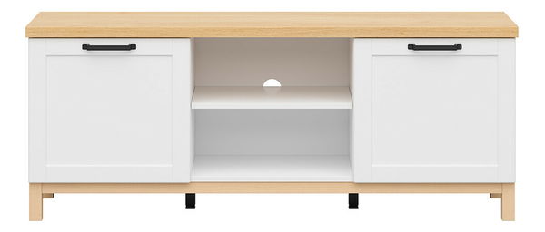 Masa TV din gama modelului Haga are un design modern și atractiv. Pe părțile laterale se află dulapuri care conțin câte un raft în interior. Partea din mijloc este împărțită de un raft în două spații de depozitare deschise potrivite pentru plasarea unei console de jocuri sau a altor dispozitive electronice. Ușa se deschide cu mânere practice.