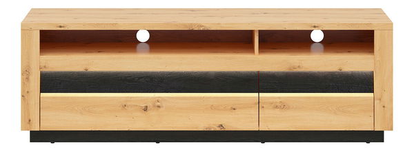 Dulap TV cu spațiu de depozitare sub forma a 2 sertare.Placa superioară (capacitate maximă 40 kg) este o bază solidă pentru un televizor mare. Nivelul de confort este oferit de iluminarea cu LED-uri și închiderea silențioasă a ușilor și a sertarelor.