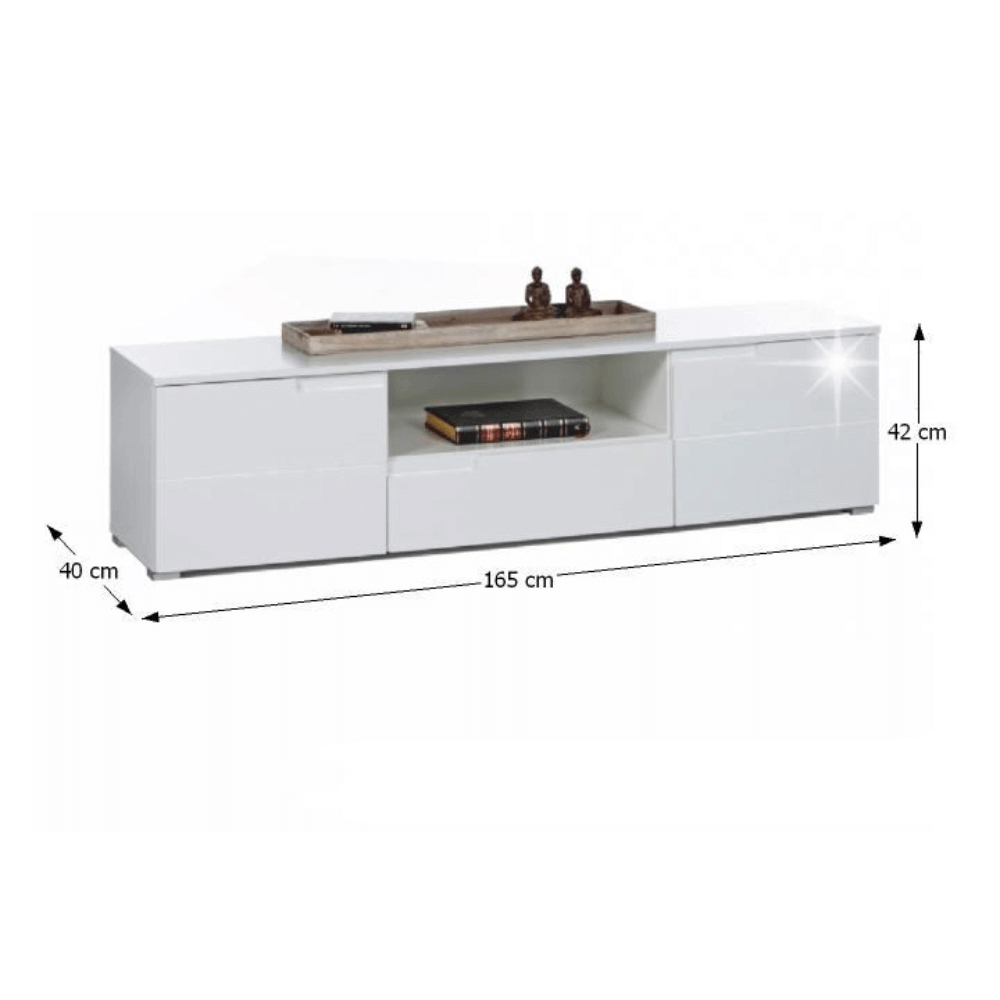 O masă TV frumoasă cu un design curat și modern va fi un accesoriu de lux în camerele de zi ale dvs. În mijloc există spațiu pentru dispozitivele AV. Mânerele sunt sculptate original chiar în colțul ușilor și a sertarelor. Versiunea color a mesei este formată din corp alb și un front alb lucios.