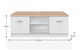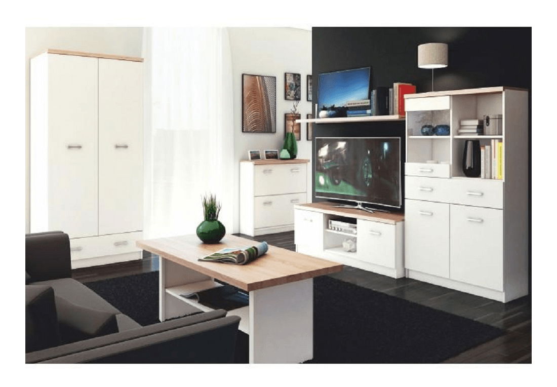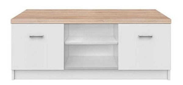 Masă TV cu un design delicat și o schemă de culori interesantă. Conține două dulapuri și două rafturi deschise pe mijloc.