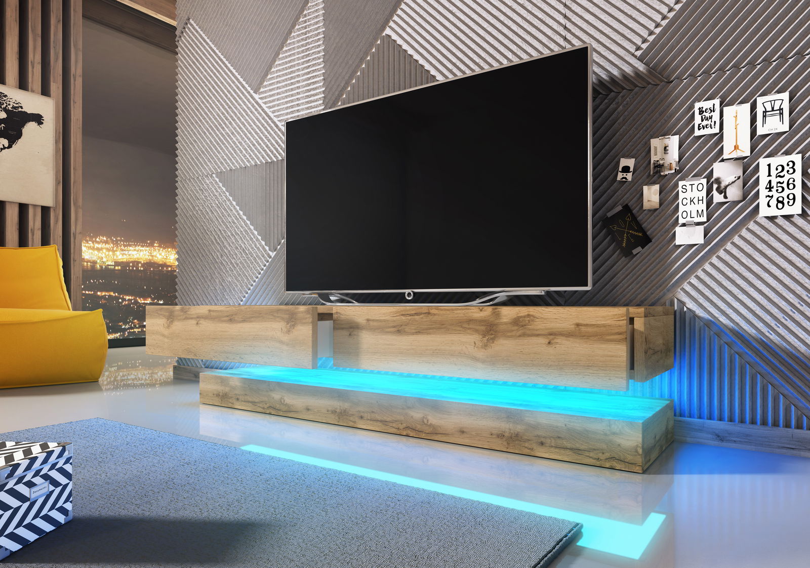 AfișeazăMasă TV elegantă, care vă va uimi la prima vedere. Masa superioară are două sertare practice pentru depozitarea cărților și a altor obiecte mici. Pentru o atmosferă ideală recomandăm achiziția iluminatului LED.