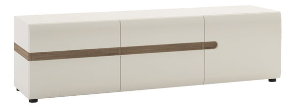 Masa TV mare din trei piese care este în nuanța de alb lucios cu un element distinctiv de design - o linie în nuanța lemnului de stejar sonoma trufe, care începe în partea de mijloc a mesei TV și se termină pe partea stângă laterală.