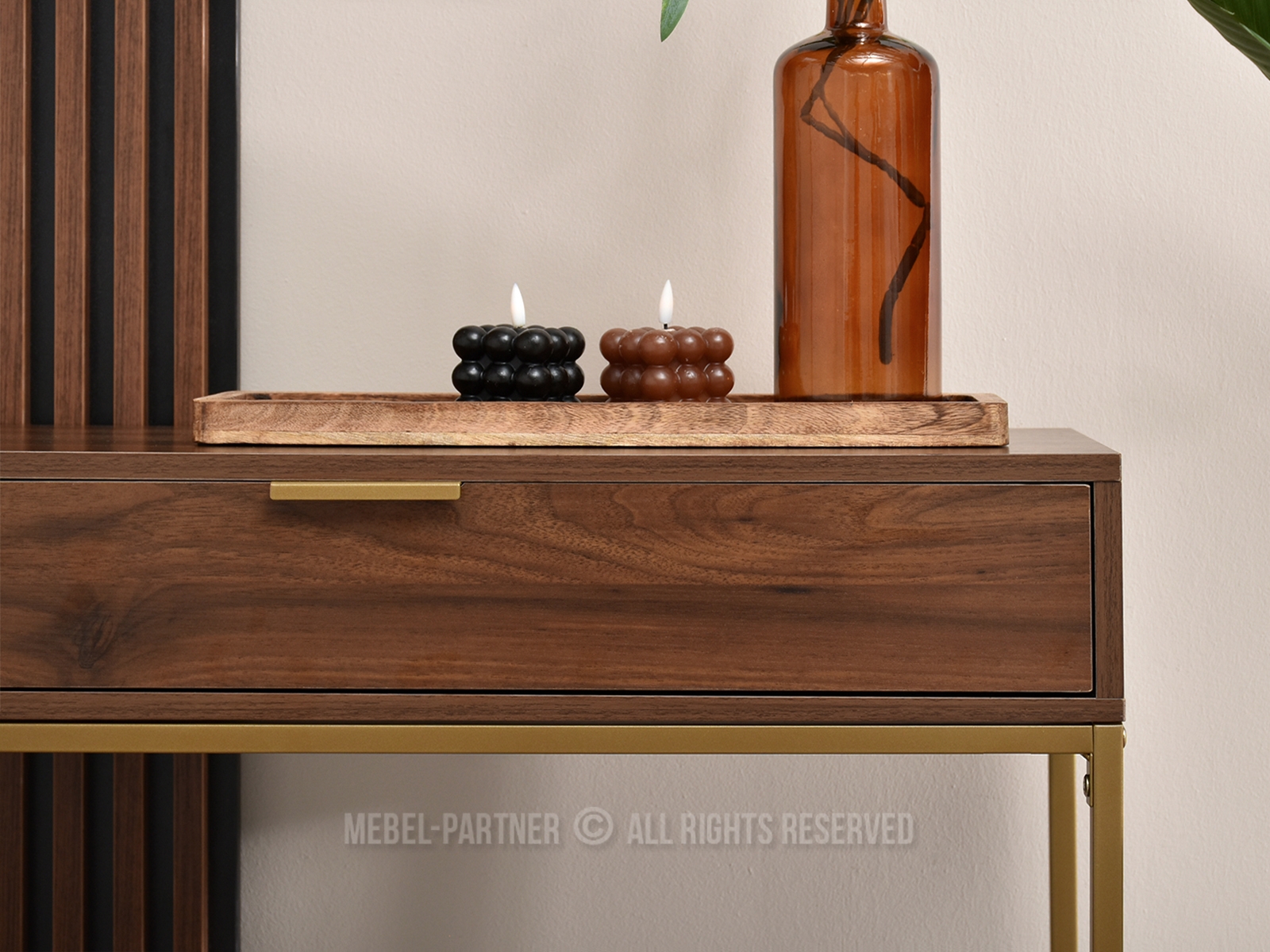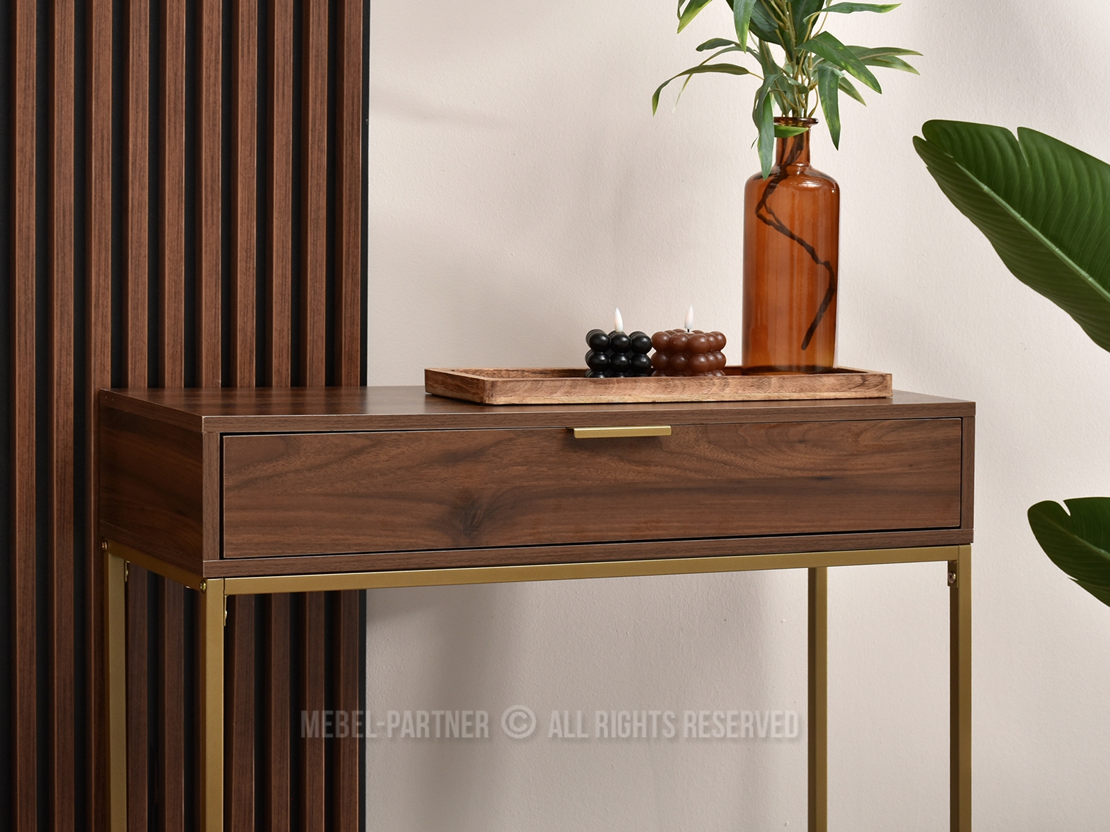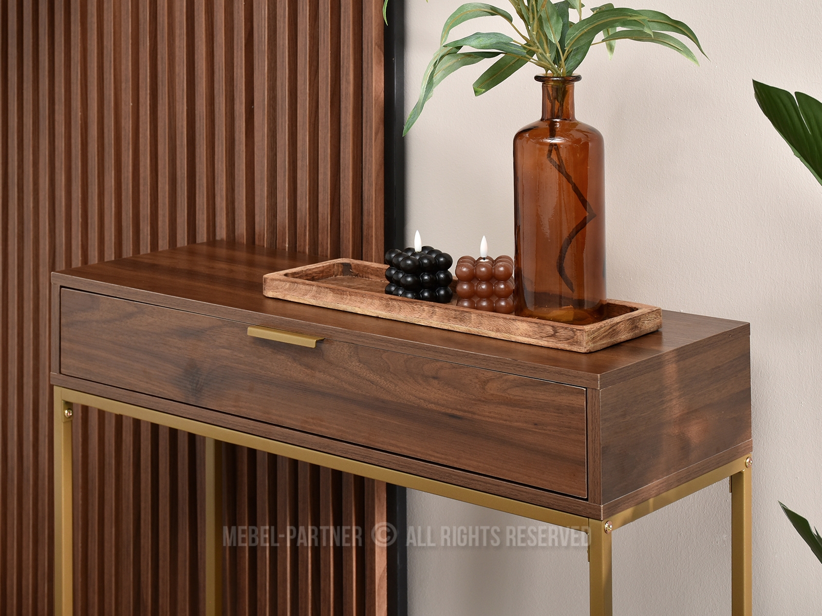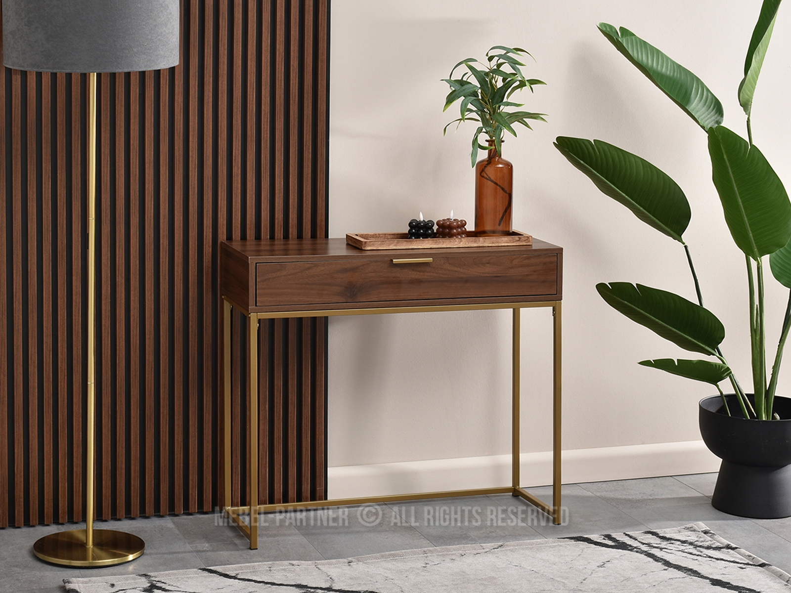 Măsuța consolă Norma M, finisată în nuanțe calde de nuc și auriu, aduce un plus de rafinament și funcționalitate fiecărui spațiu interior.