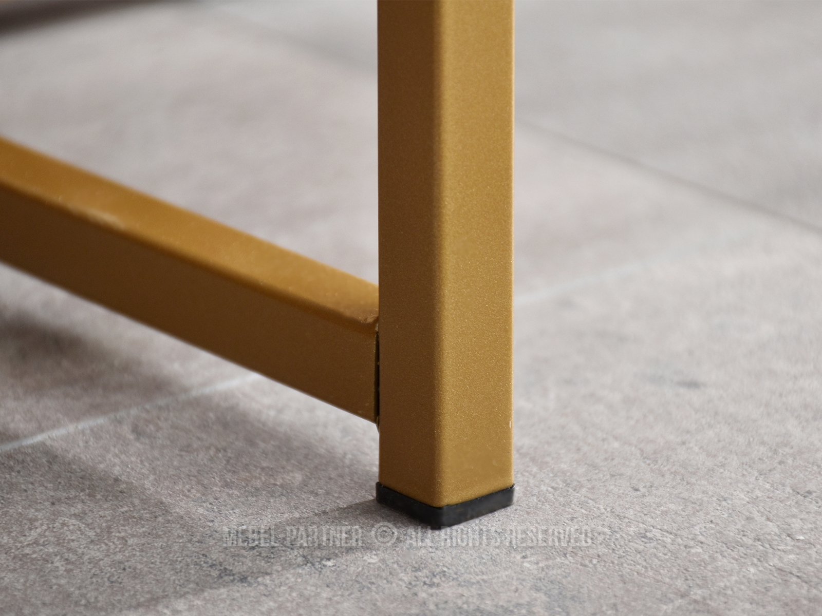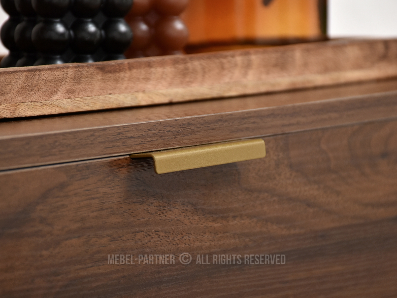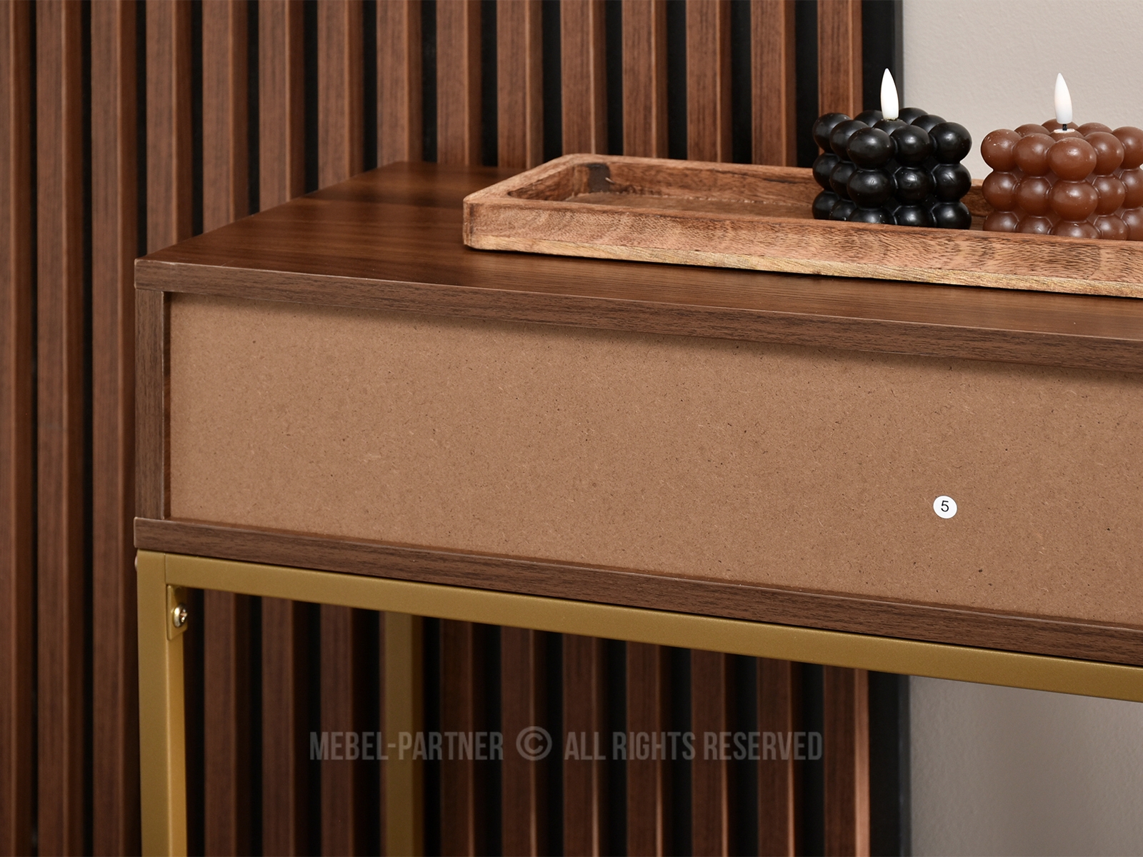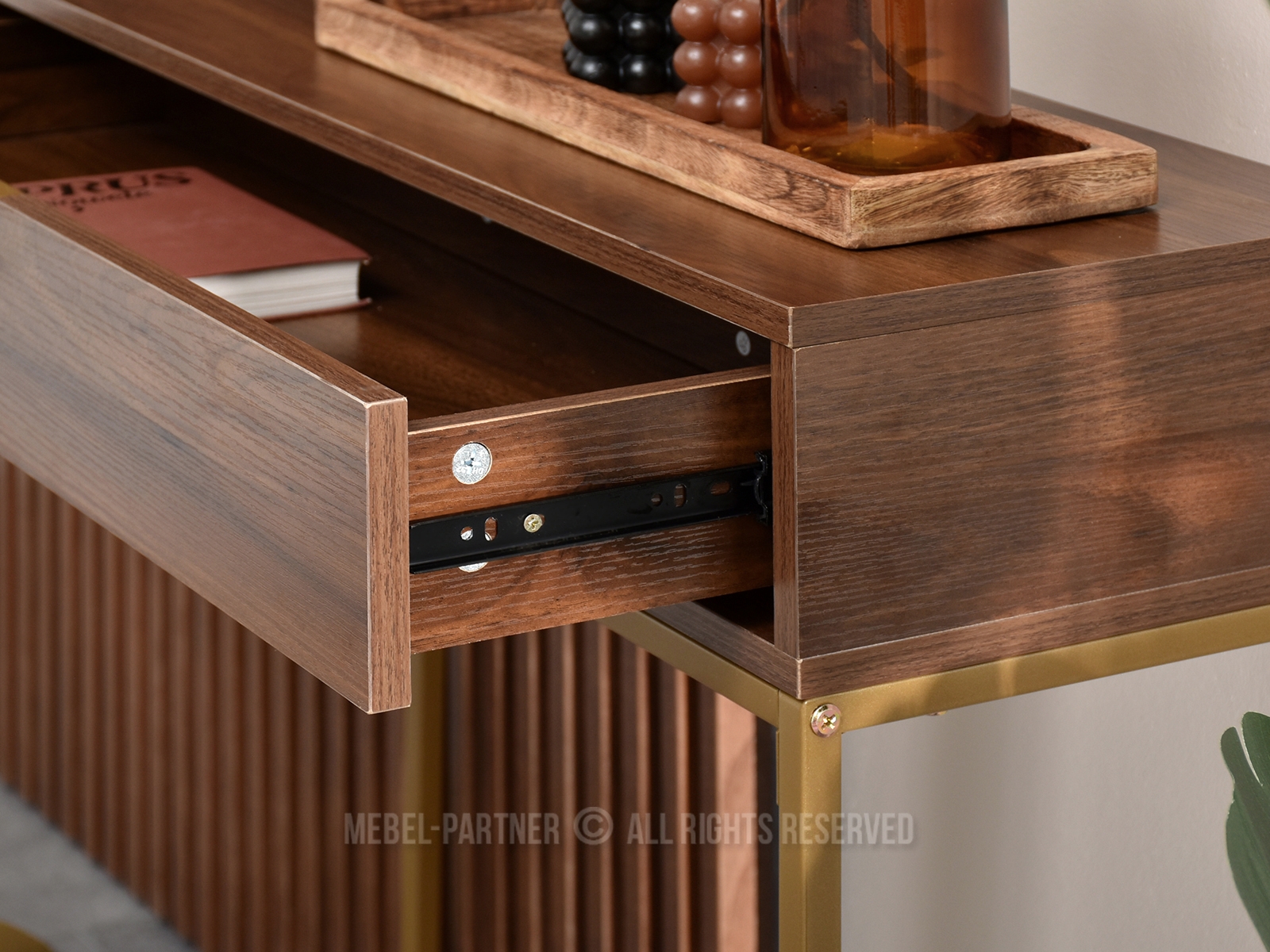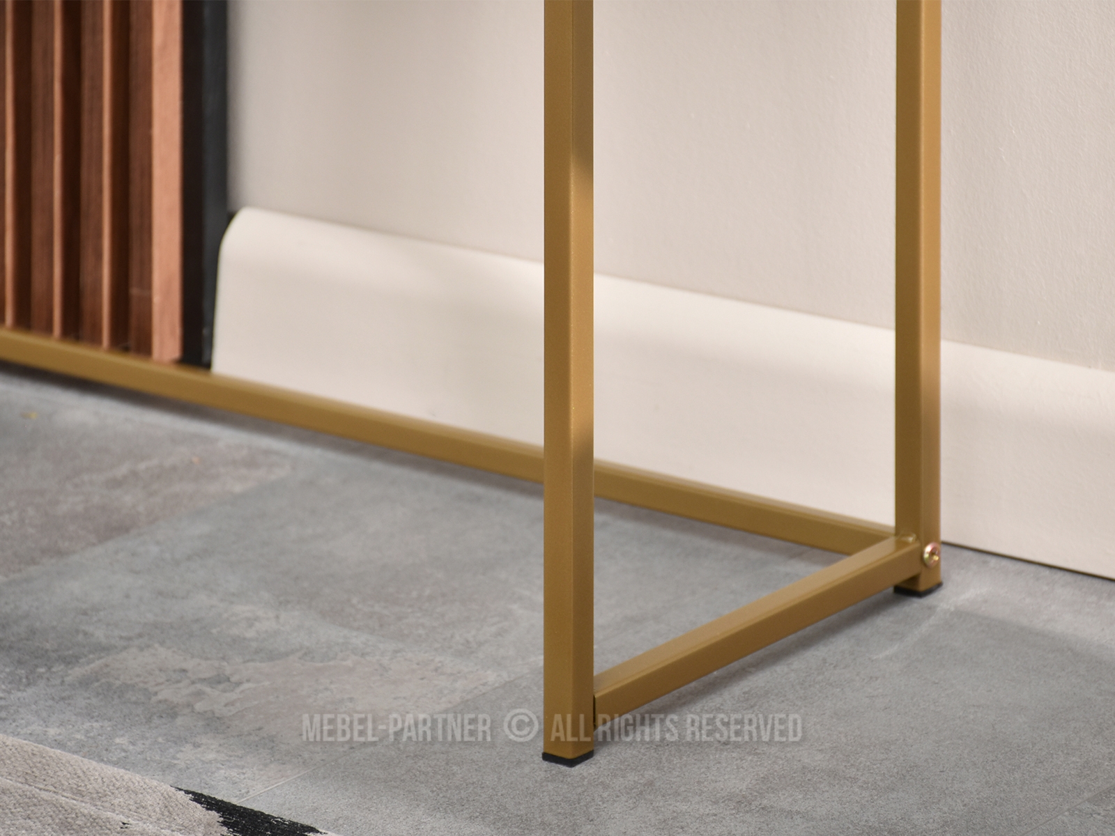 Măsuța consolă Norma M, finisată în nuanțe calde de nuc și auriu, aduce un plus de rafinament și funcționalitate fiecărui spațiu interior.