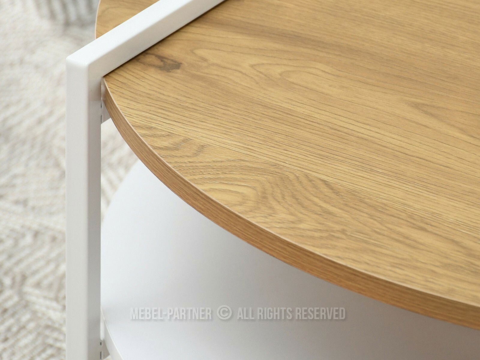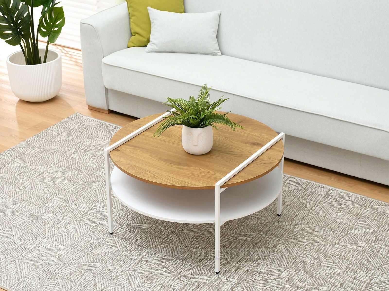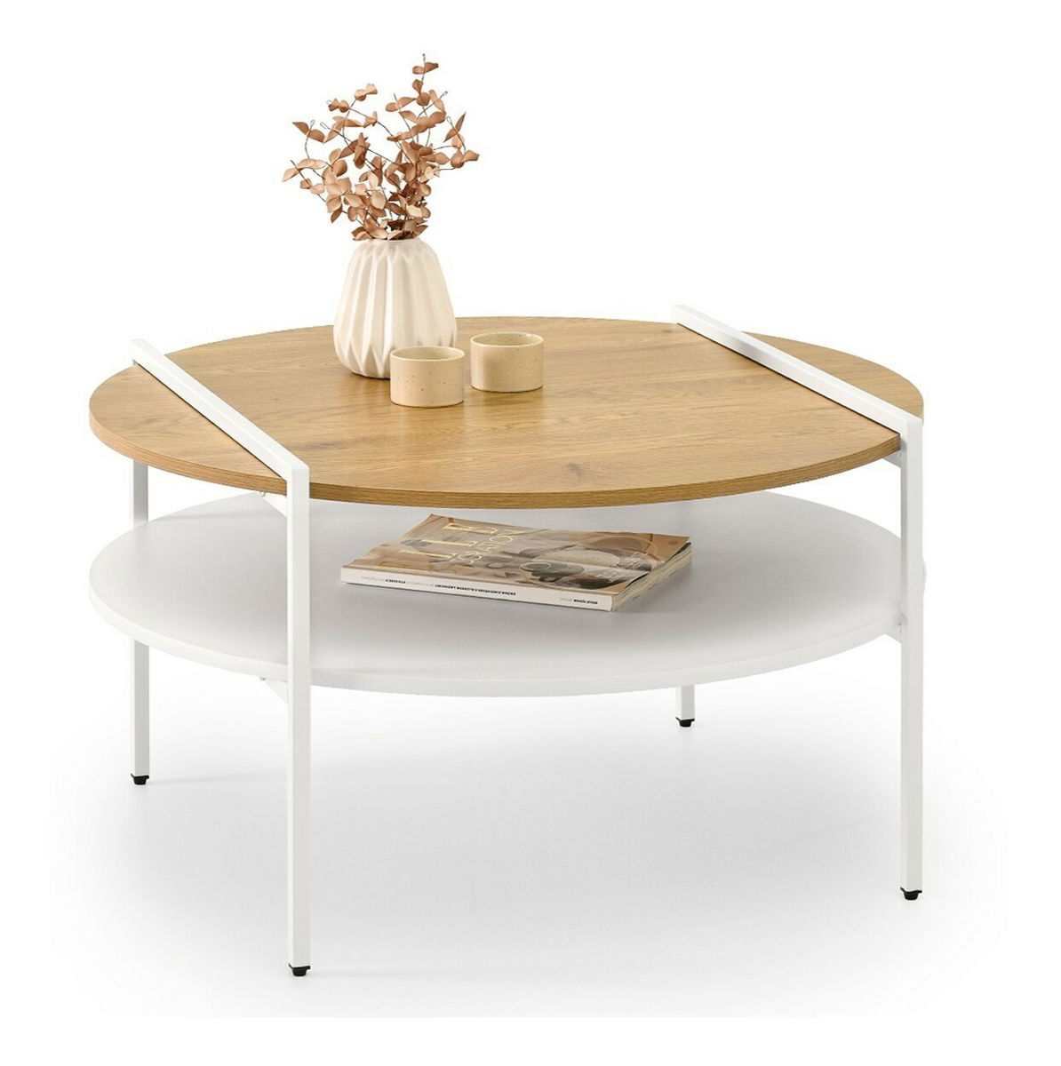 Măsuța de cafea Dario, realizată din stejar alb și metal alb, aduce prospețime și funcționalitate oricărui living modern. Designul său rotund, cu două niveluri, oferă spațiu generos pentru depozitare, ideal pentru cărți, reviste sau accesorii de cafea. Combinația subtilă dintre nuanțele naturale ale lemnului de stejar și structura metalică albă creează un echilibru perfect între robustețe și stil minimalist.