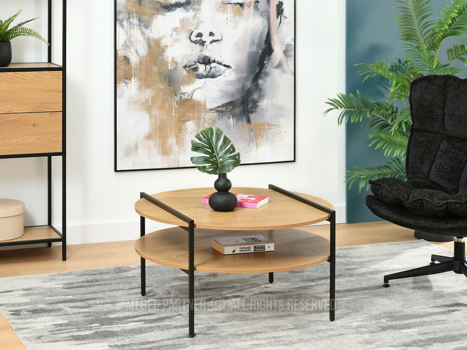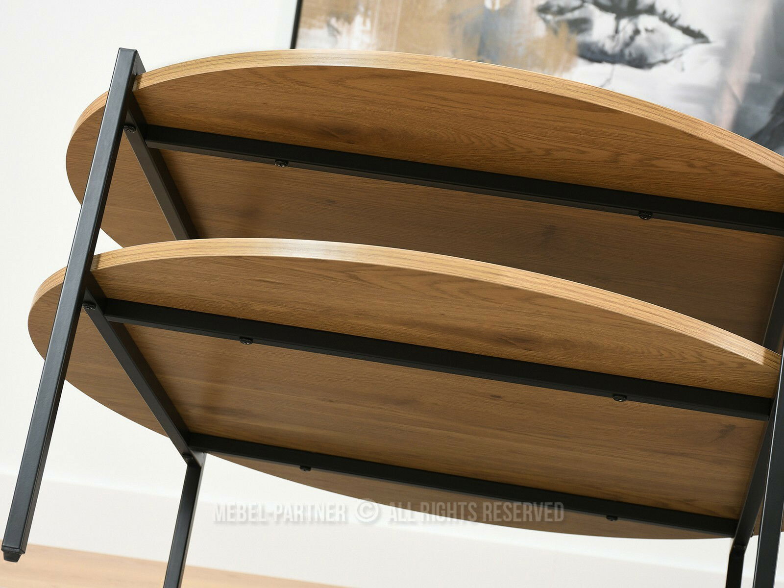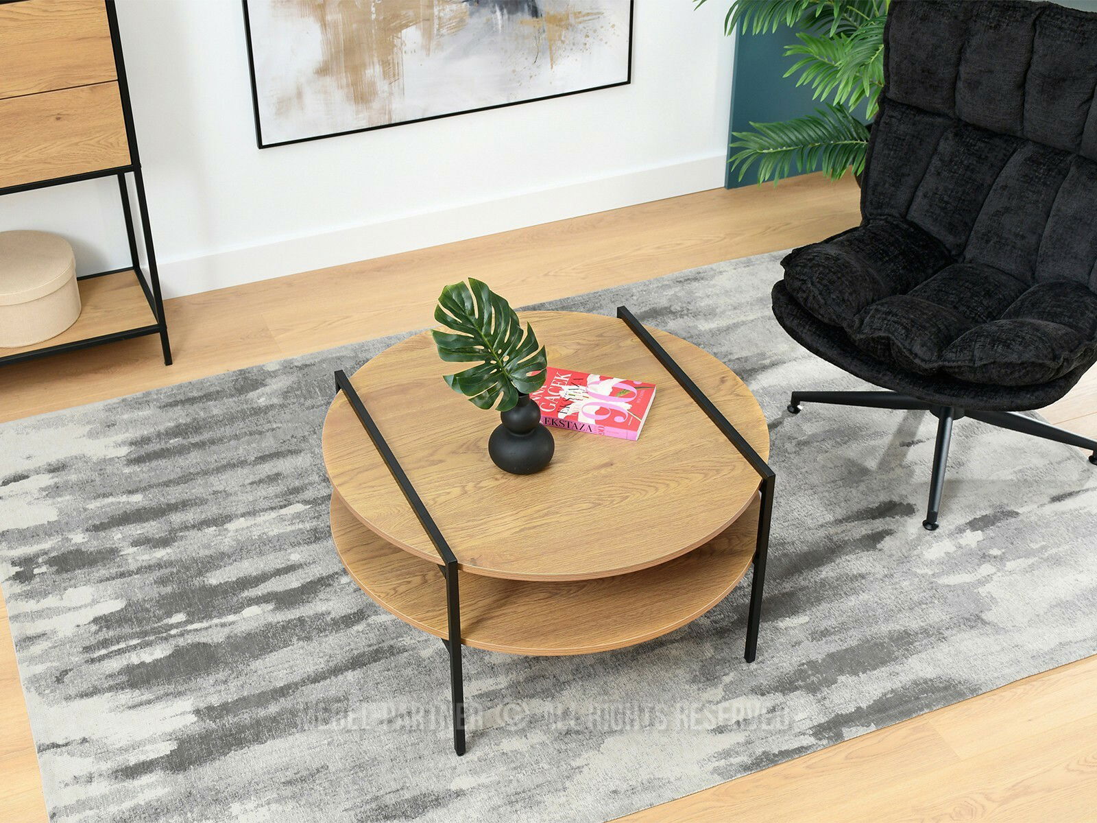 Măsuța se potrivește atât pentru livinguri spațioase, cât și pentru zone compacte de relaxare. Se integrează armonios în stiluri industrial, scandinav sau contemporan, aducând căldură prin nuanța lemnului și un contrast modern prin structura metalică.